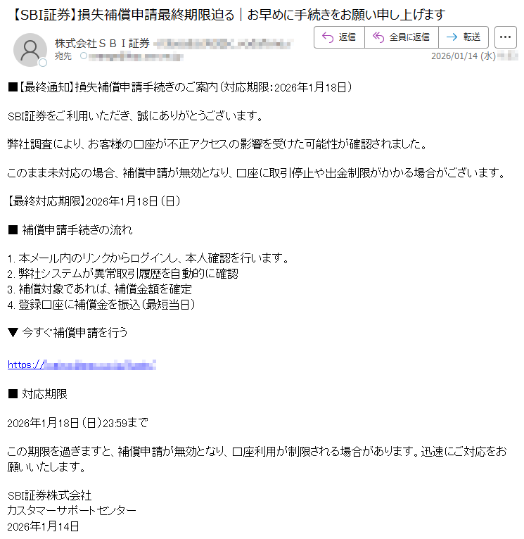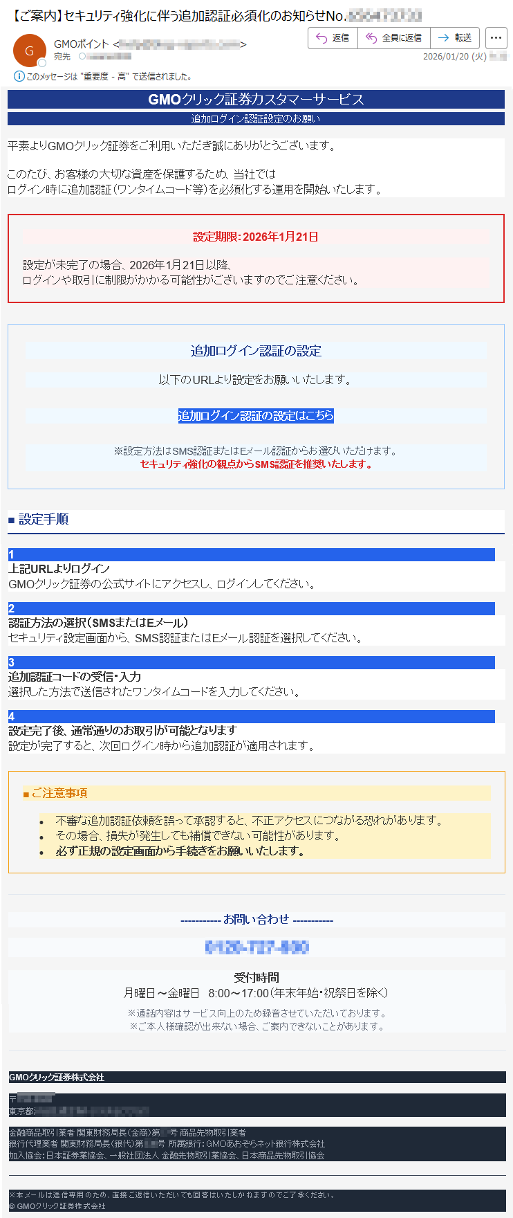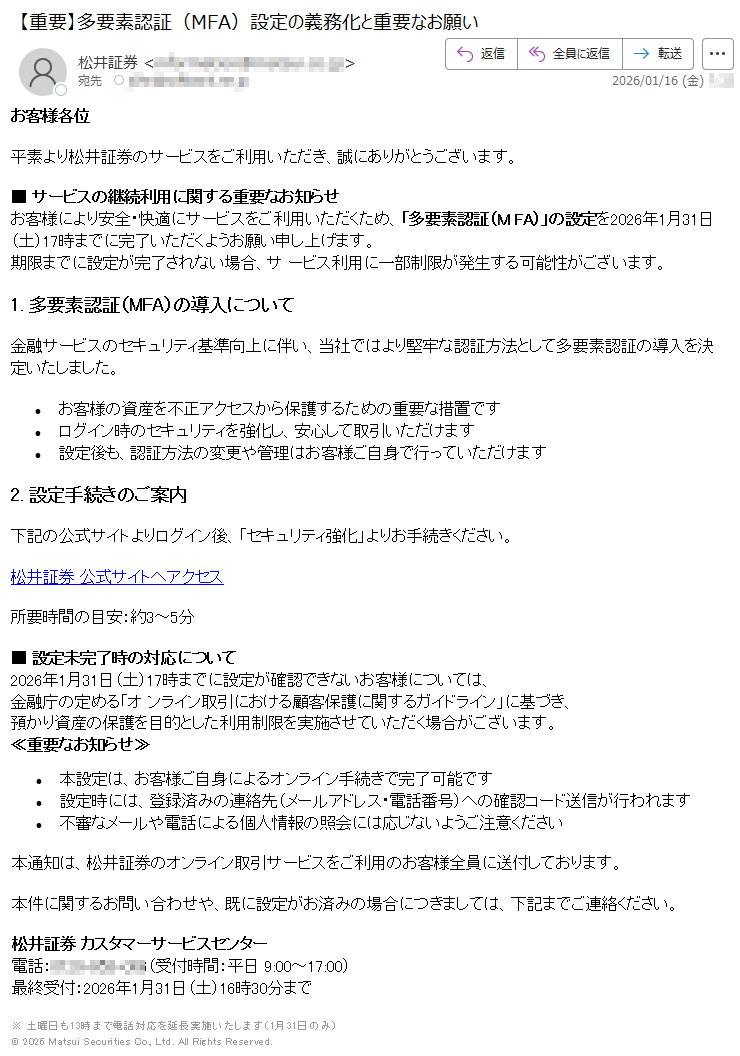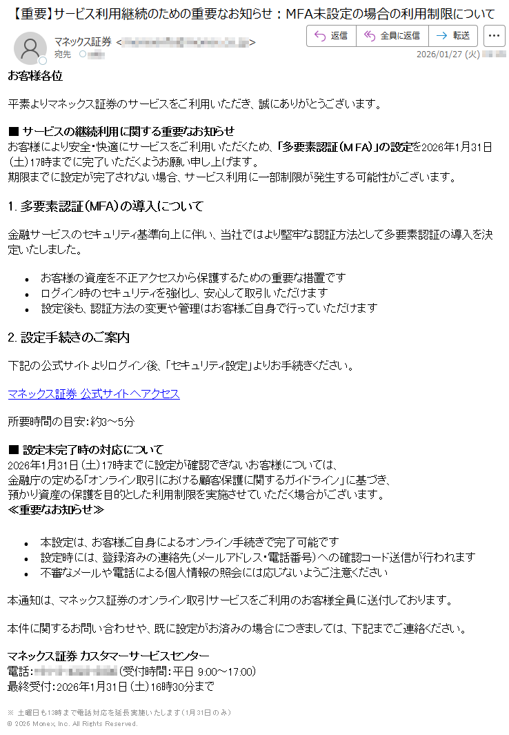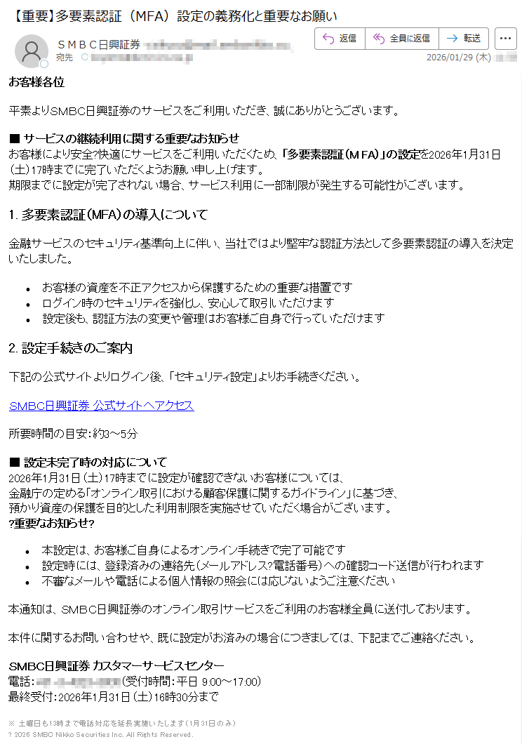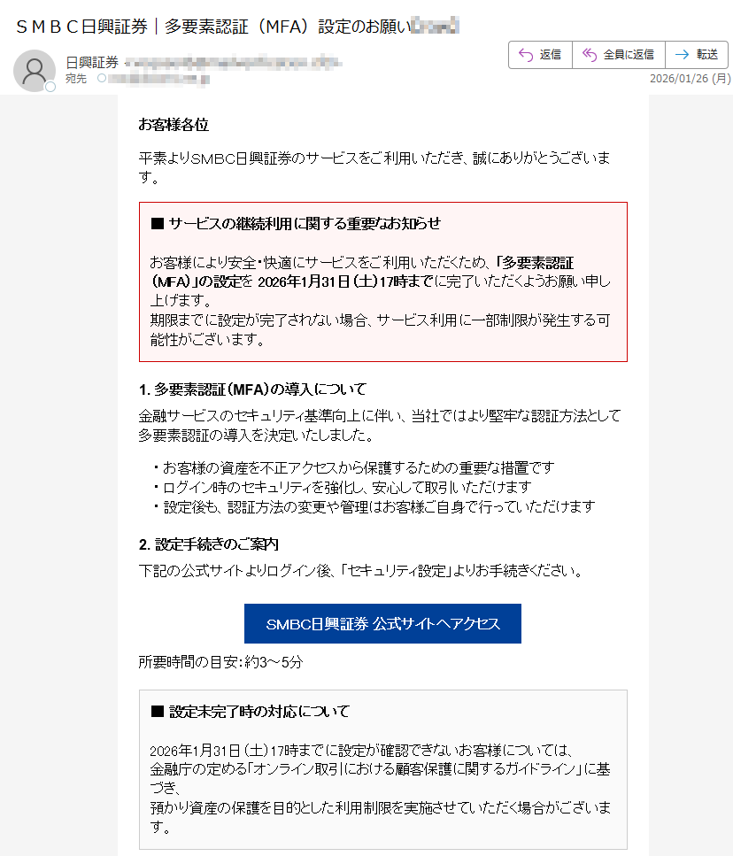 ![SMBC日興証券株式会社【緊急】セキュリティ強化:信頼端末の登録をお願いしますお客様各位平素より、SMBC日興証券株式会社のサービスをご利用いただき、誠にありがとうございます。【重要なお知らせ】お客様の資産保護および不正アクセス防止を目的として、オンライン取引サービスに「信頼端末認証」機能を導入いたします。対応期限:2026年01月10日09時まで1.信頼端末認証について信頼端末認証とは、お客様が日常的にご利用されている端末をあらかじめ登録することで、第三者による不正ログインを防止する追加のセキュリティ機能です。•普段ご利用の端末を信頼端末として登録可能•未登録端末からのログイン時には追加認証を実施•登録状況はマイページより確認・変更可能2.お手続きのお願い対応期限までに、下記公式サイトへアクセスのうえ、ログイン後にお手続きいただきますようお願い申し上げます。▼SMBC日興証券株式会社公式サイト[https://*****]【重要】認証手続きの期限について金融庁をはじめとする関係官庁の指導に基づき、2026年01月10日09時までに信頼端末認証の設定が完了していない場合、お客様の口座における一部取引に制限が発生いたします。取引制限が発生した場合、制限解除には当社カスタマーサービスセンターへのご来店および本人確認書類のご提示が必要となります。期限内の設定完了にご協力くださいますようお願い申し上げます。≪ご案内≫•本認証設定は資産保護のための重要なセキュリティ対策です•設定手続きはマイページからオンラインで完了可能です(約3分)•ご不明点はカスタマーサービスセンターまでお問い合わせください本メールは、当社サービスをご利用のお客様全般に配信しております。万が一、本メールにお心当たりのない場合は、お手数ではございますが下記窓口までご連絡ください。SMBC日興証券株式会社カスタマーサービスセンター受付時間:平日9:00~18:00(年末年始を除く)お問い合わせ受付最終日時:2026年01月10日09時©2026SMBCNikkoSecuritiesInc.AllRightsReserved.](../../../images/alert/2026/1m/nise_mail0109_04.png)