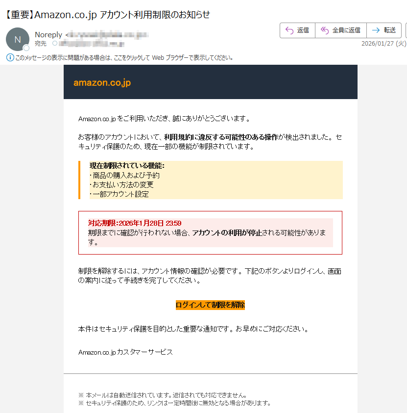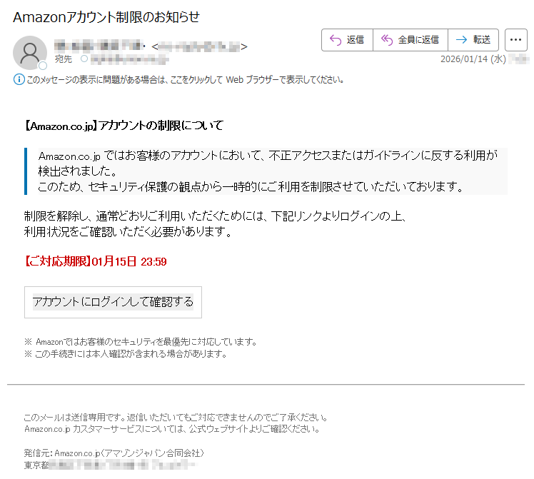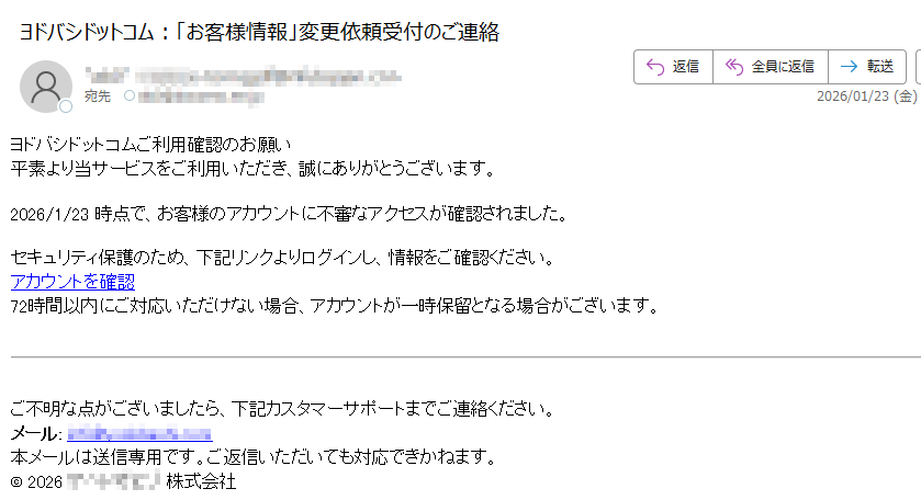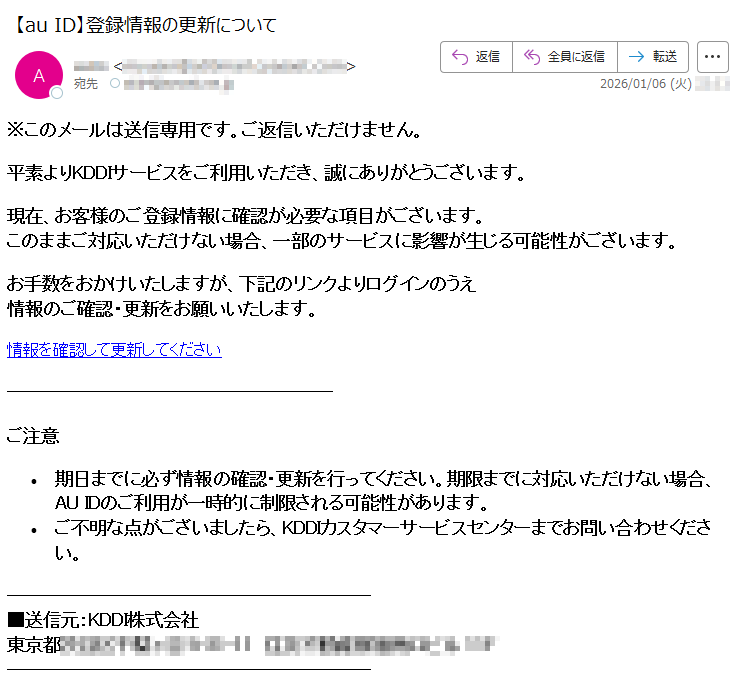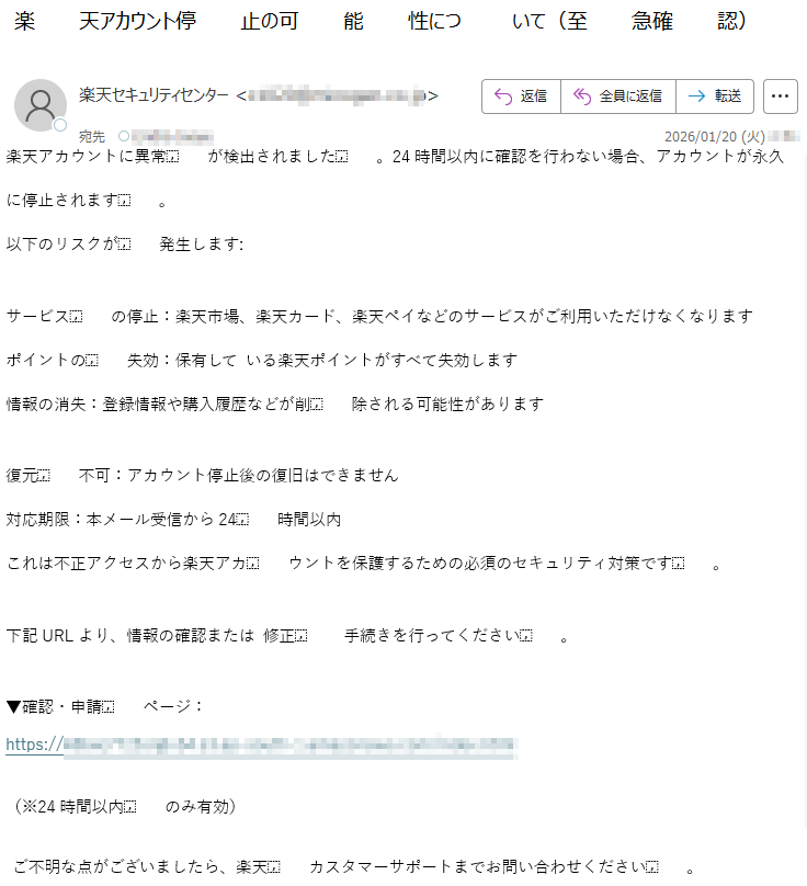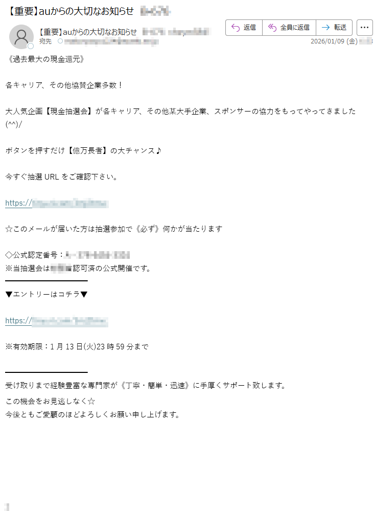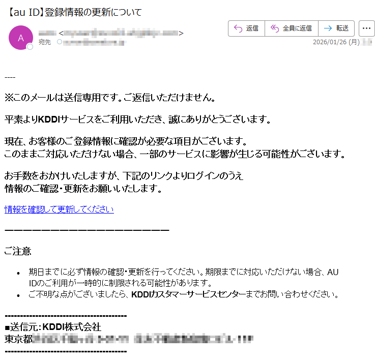 2026年1月29日現在、以下の迷惑メール・詐欺メールが送信されているので気をつけてください。