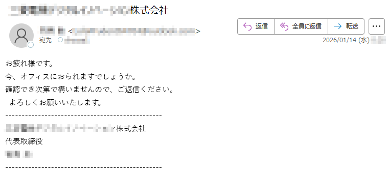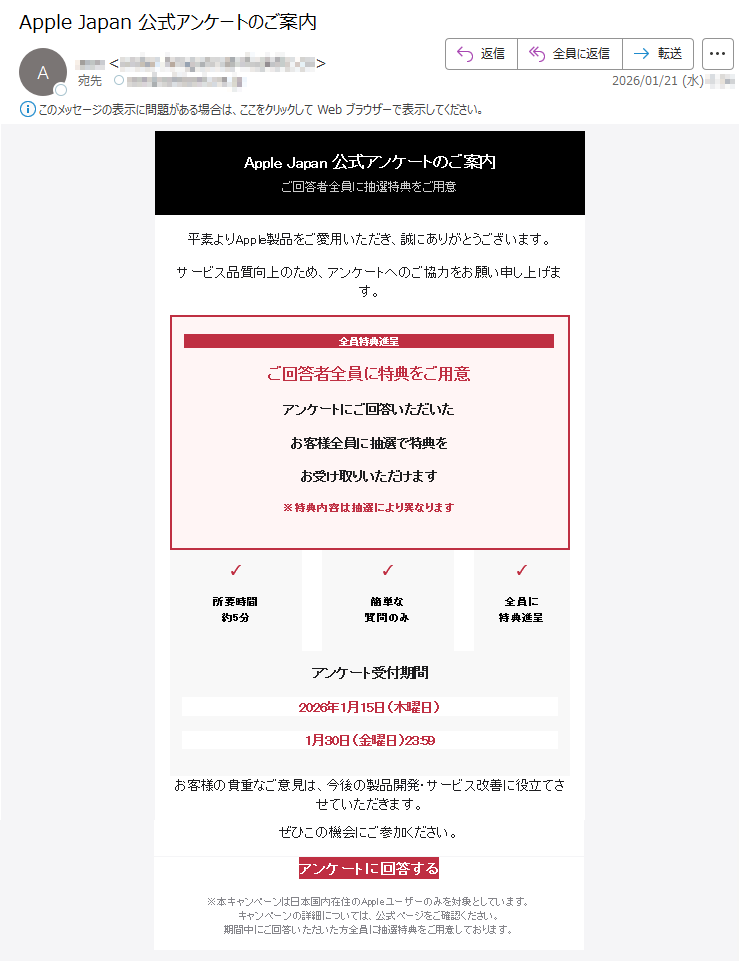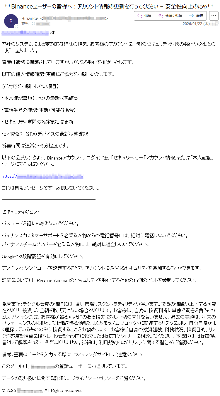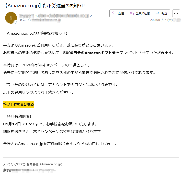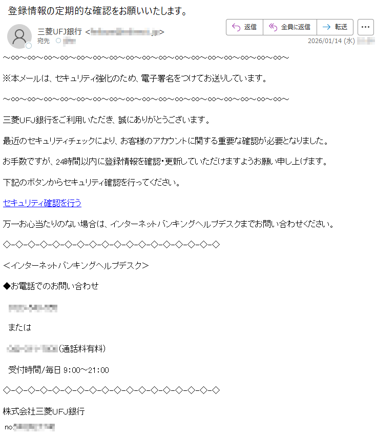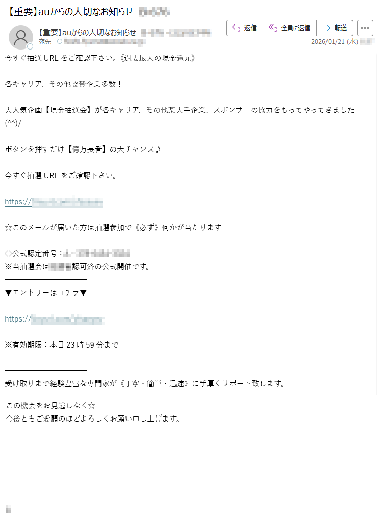 2026年1月29日現在、以下の迷惑メール・詐欺メールが送信されているので気をつけてください。