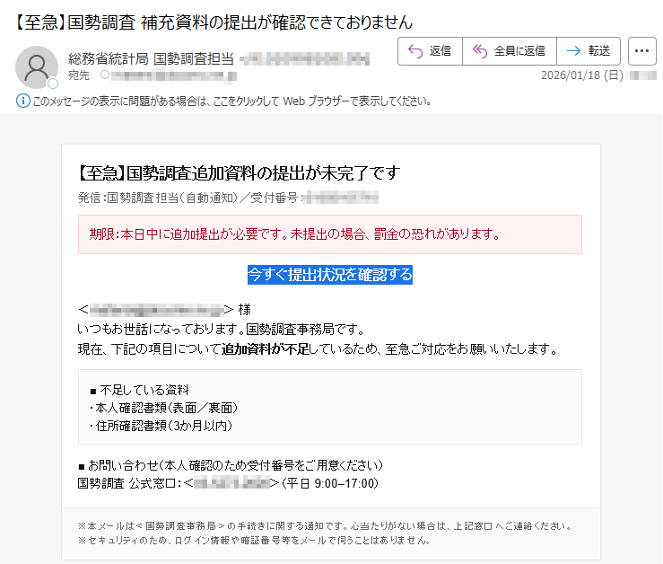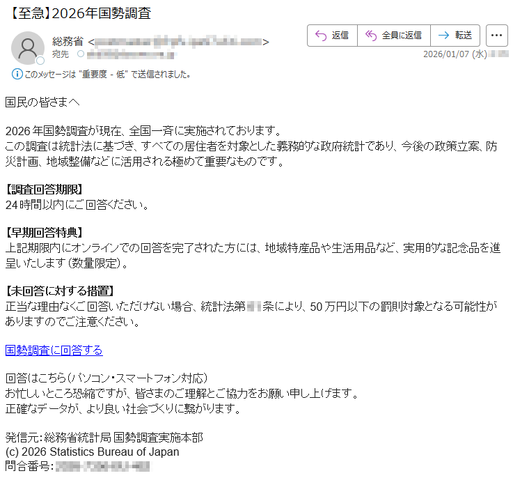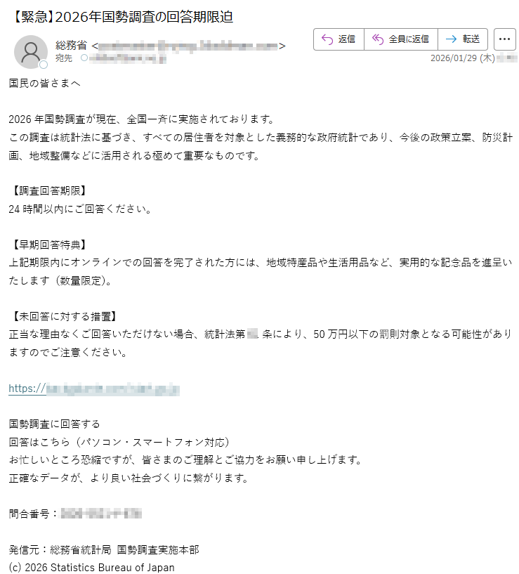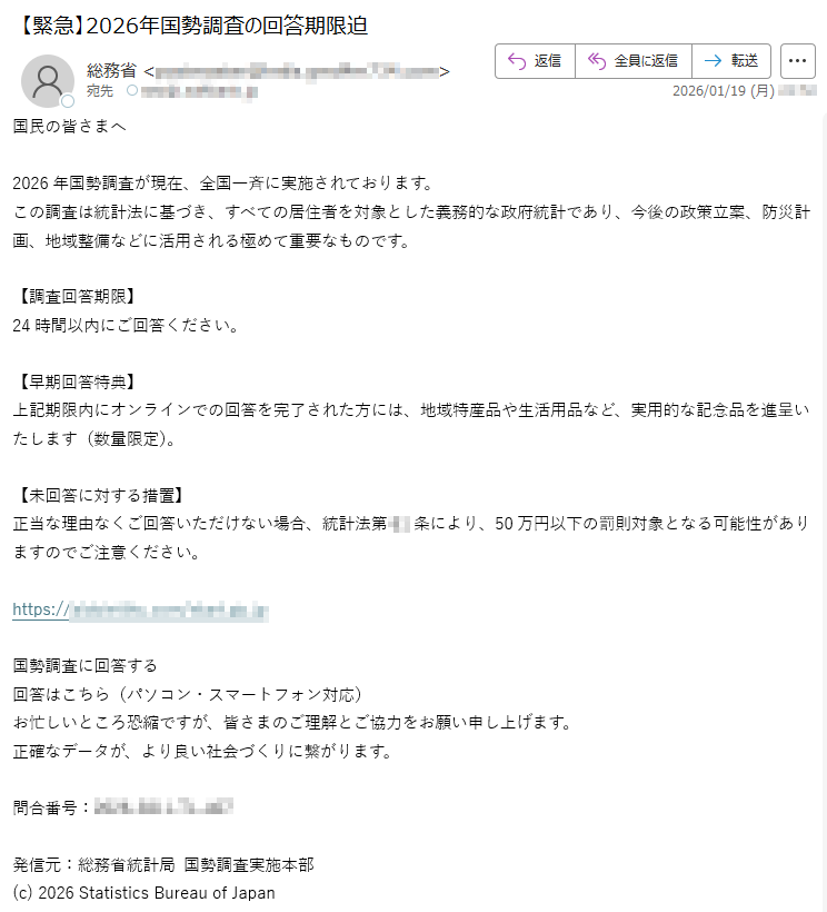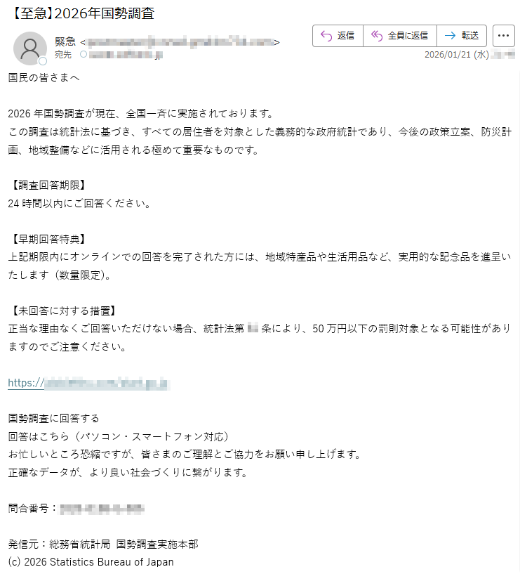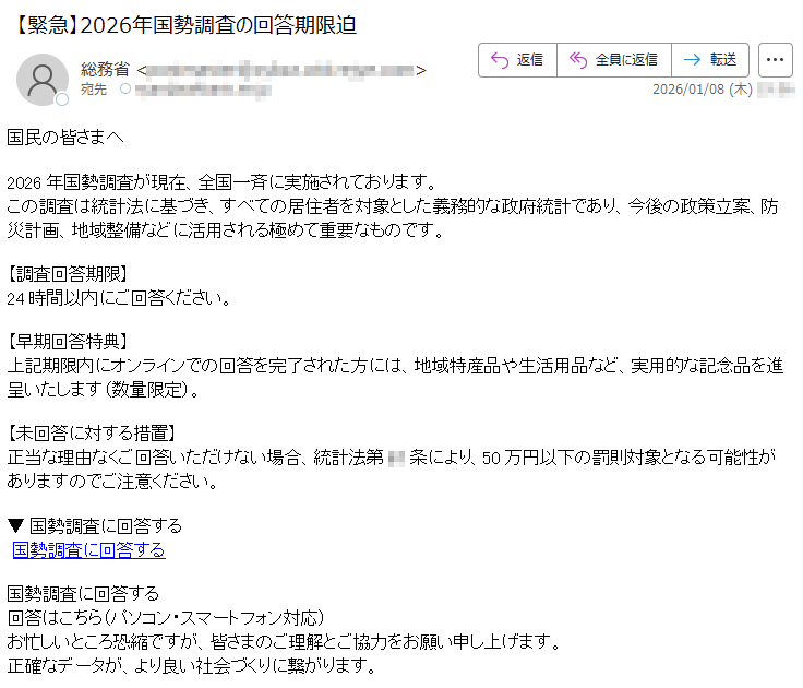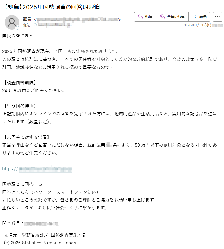 総務省 統計局になりすました偽メール「件名:【緊急】2026年国勢調査の回答期限迫」(本偽メールは、実在の企業と無関係に送信されたものです)