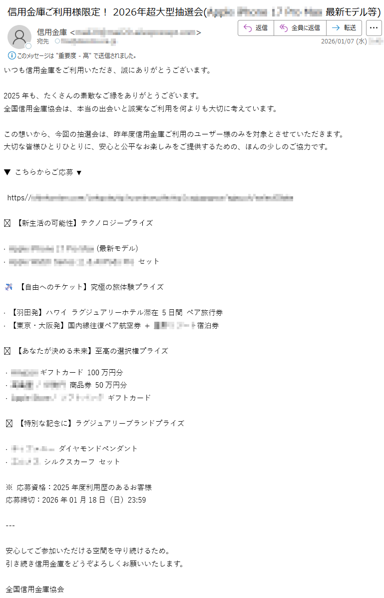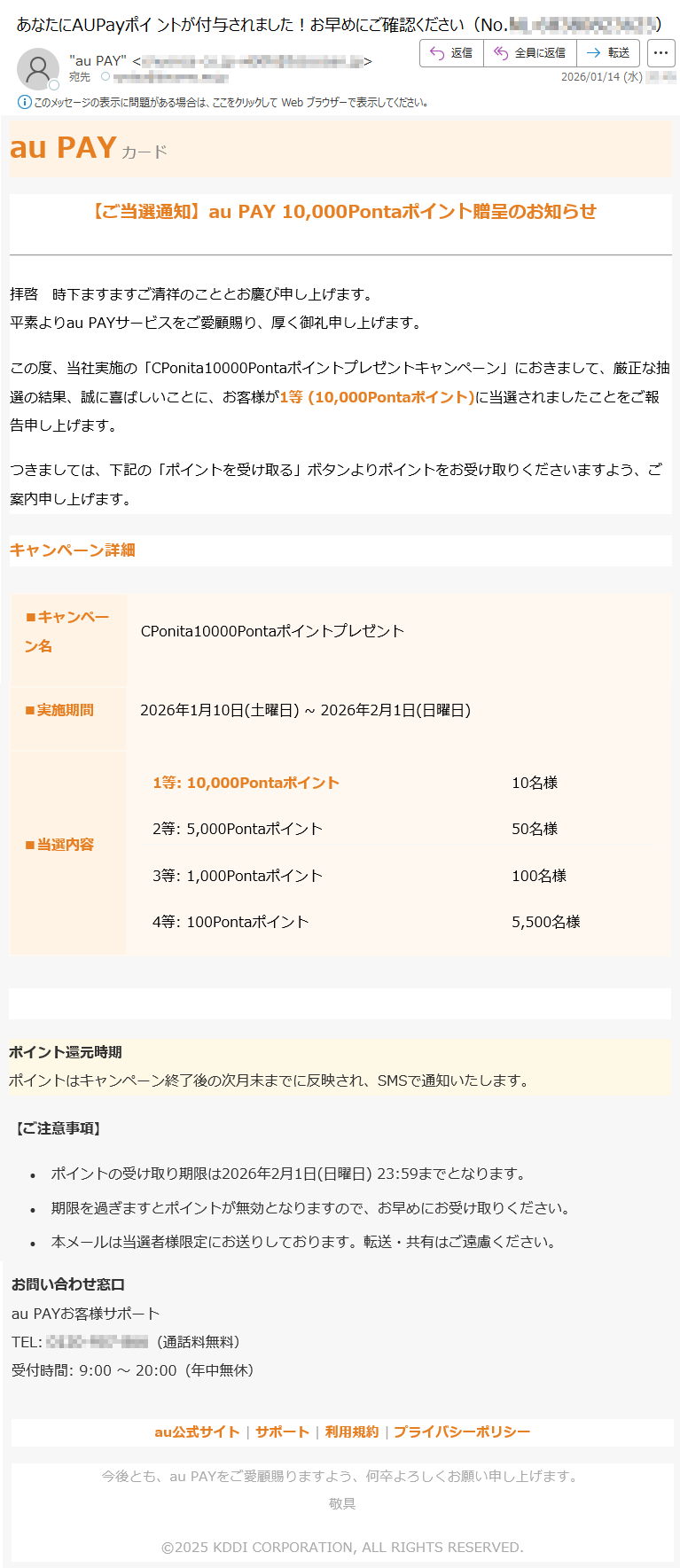 - 詐欺メールと思われますので、このようなメールには反応せずに無視してください。