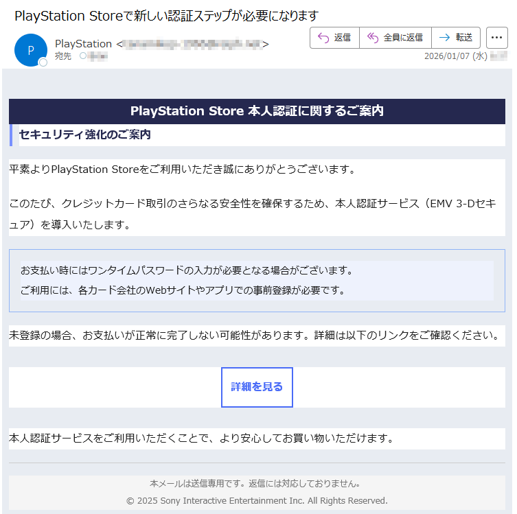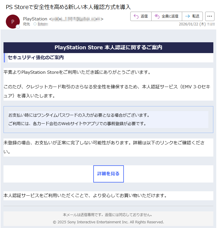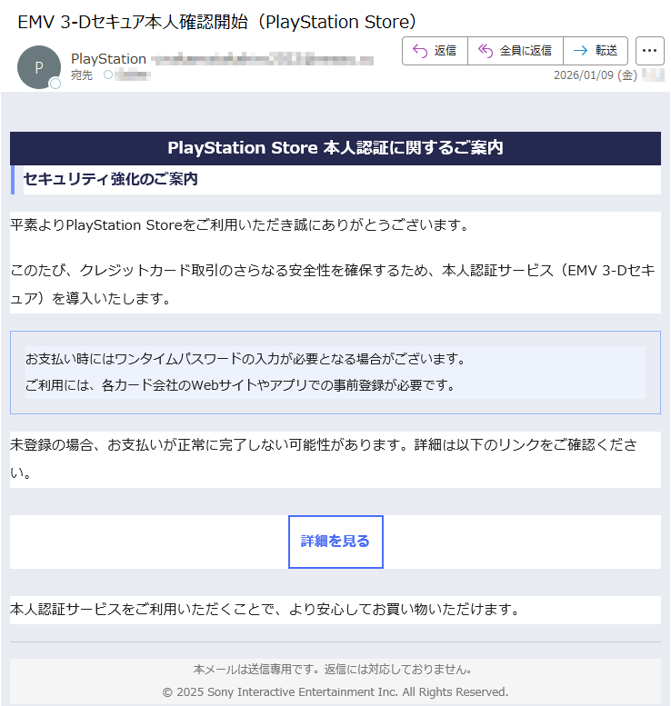 ![【重要】Nintendo Switch Online 自動継続購入に関するお知らせ ※本メールは、Nintendo Switch Onlineの自動継続購入が完了できなかった方に送付しております。 下記のいずれかの理由により、「2026/1/27(JST)」からのご利用分の決済が完了できませんでした。 【お支払い方法を設定済みの場合】•クレジットカードまたはPayPalが決済に利用できない。 [例]•登録されているクレジットカードの有効期限が切れている。 •その他の理由でクレジットカードが使用できない。 【お支払い方法を未設定の場合】•ニンテンドーeショップの残高が不足している。 引き続きNintendo Switch Onlineのサービスをご利用いただくには、ニンテンドーeショップまたは下記のリンクより、再度利用券をご購入ください。 ▼ 利用券を再度購入する このメールアドレスには返信できません。ご不明な点がございましたら、以下のリンクをご参照ください:•Nintendo Switch Online •任天堂サポートサイト 任天堂株式会社京都府](../../../images/alert/2026/1m/nise_mail0127_13.png)