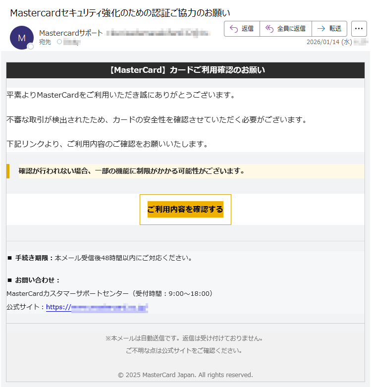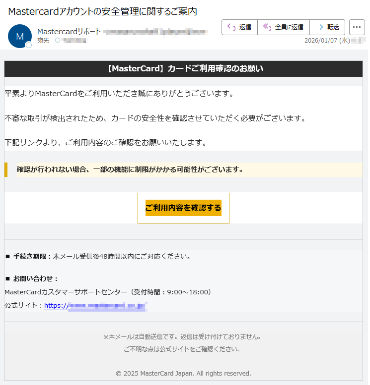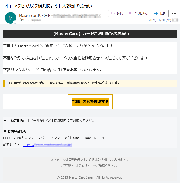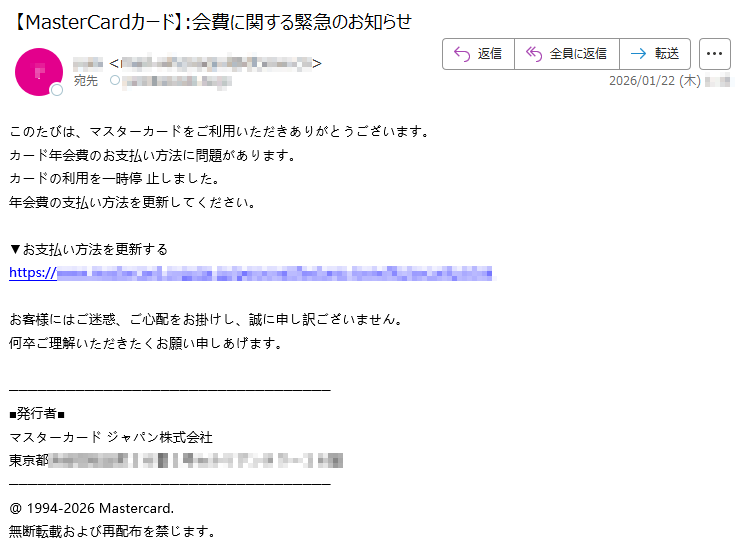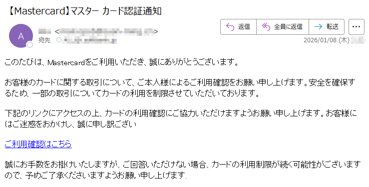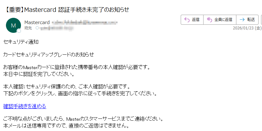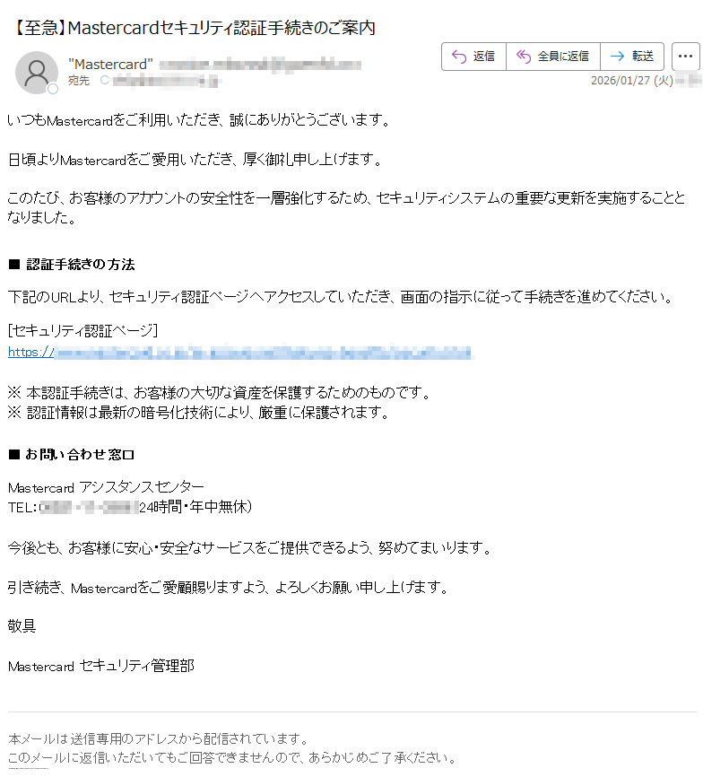 ![いつもMastercardをご利用いただき、誠にありがとうございます。日頃よりMastercardをご愛用いただき、厚く御礼申し上げます。このたび、お客様のアカウントの安全性を一層強化するため、セキュリティシステムの重要な更新を実施することとなりました。■ 認証手続きの方法下記のURLより、セキュリティ認証ページへアクセスしていただき、画面の指示に従って手続きを進めてください。[セキュリティ認証ページ]https:// ※ 本認証手続きは、お客様の大切な資産を保護するためのものです。※ 認証情報は最新の暗号化技術により、厳重に保護されます。■ お問い合わせ窓口Mastercard アシスタンスセンターTEL:(24時間・年中無休)今後とも、お客様に安心・安全なサービスをご提供できるよう、努めてまいります。引き続き、Mastercardをご愛顧賜りますよう、よろしくお願い申し上げます。敬具Mastercard セキュリティ管理部本メールは送信専用のアドレスから配信されています。このメールに返信いただいてもご回答できませんので、あらかじめご了承ください。](../../../images/alert/2026/1m/nise_mail0127_22.png)