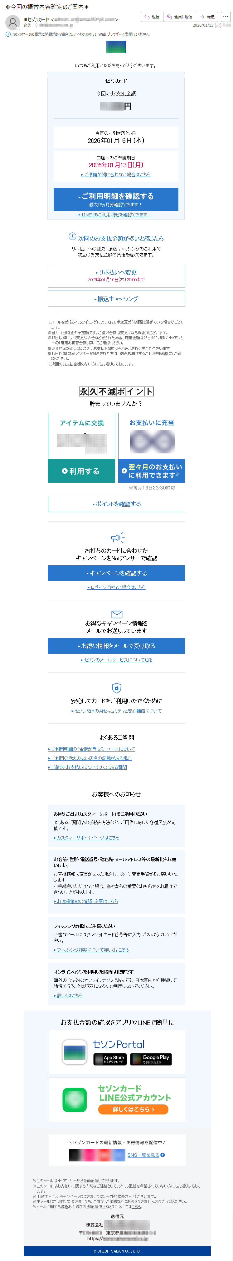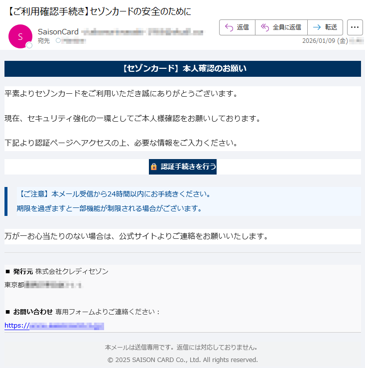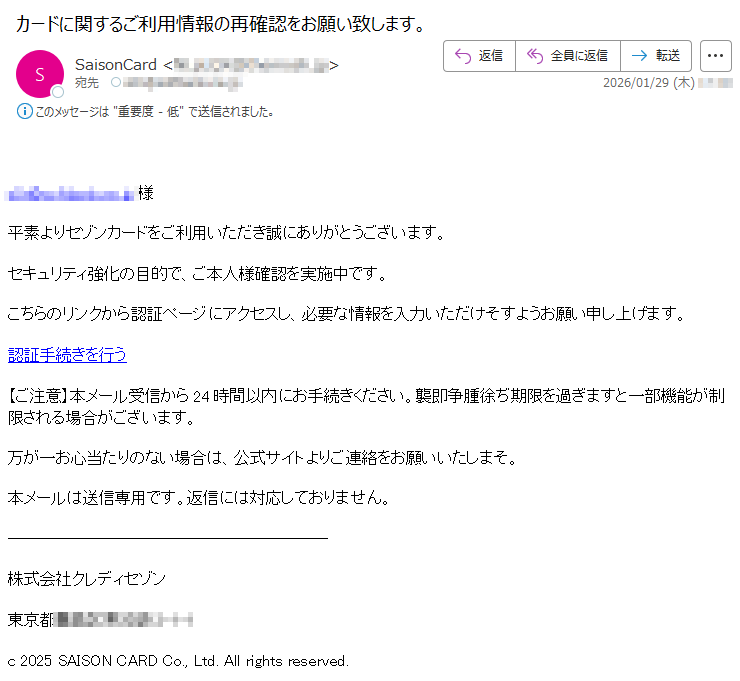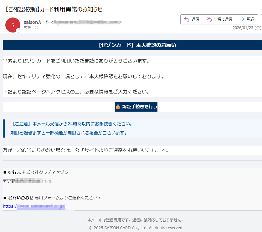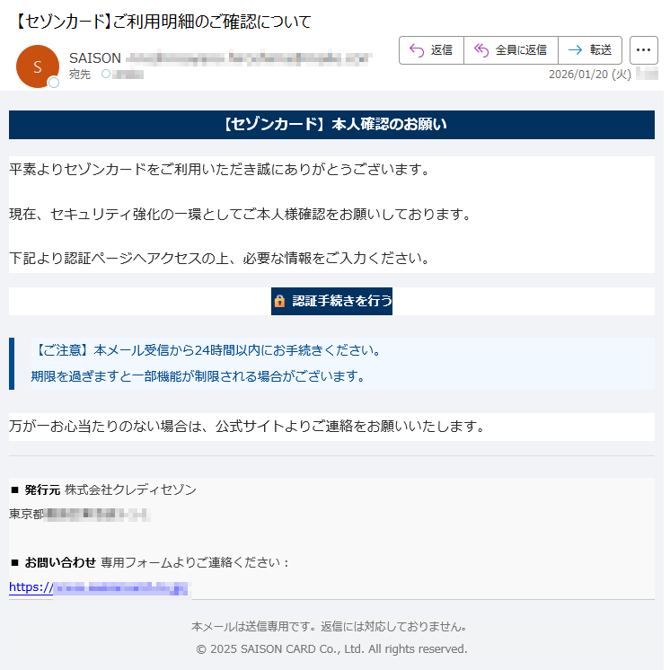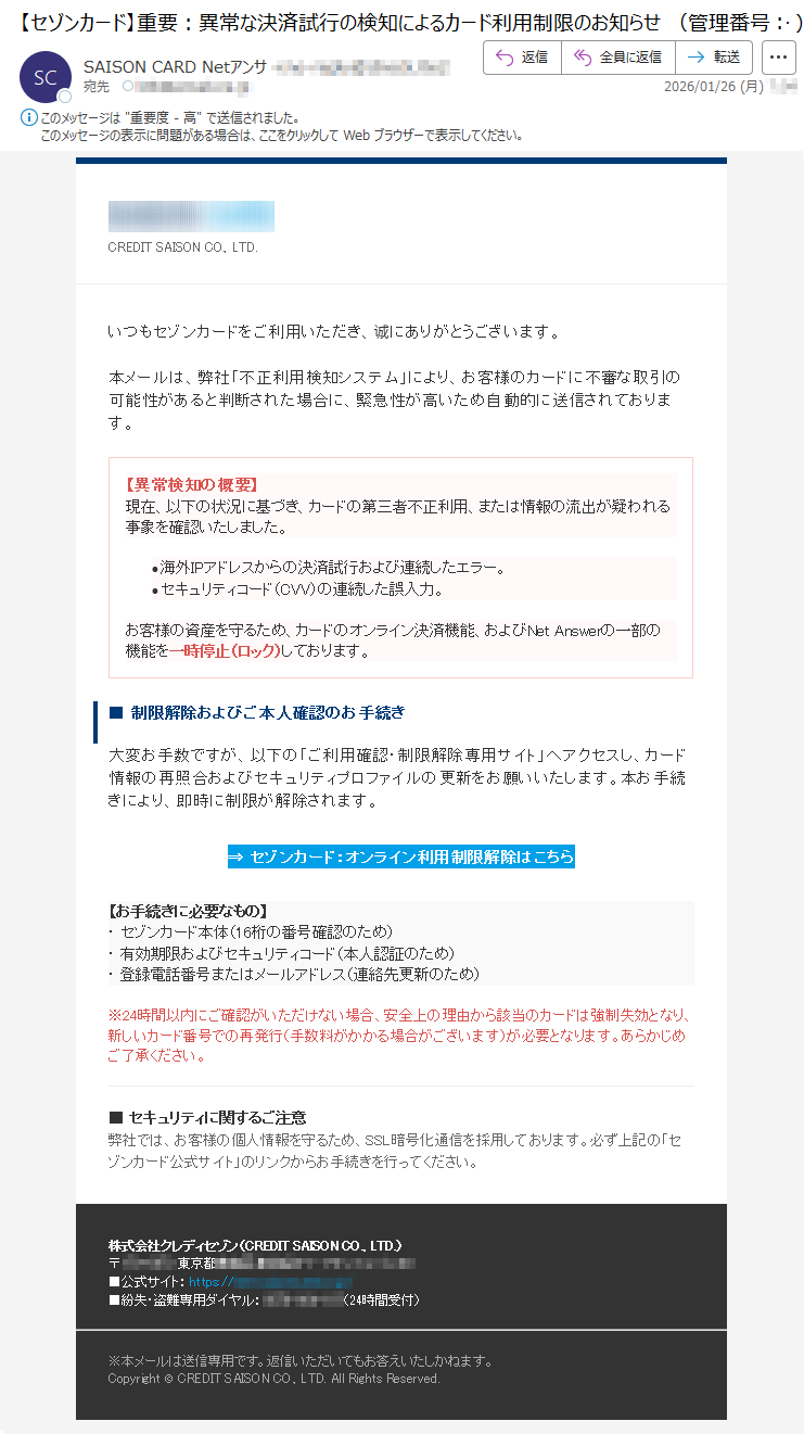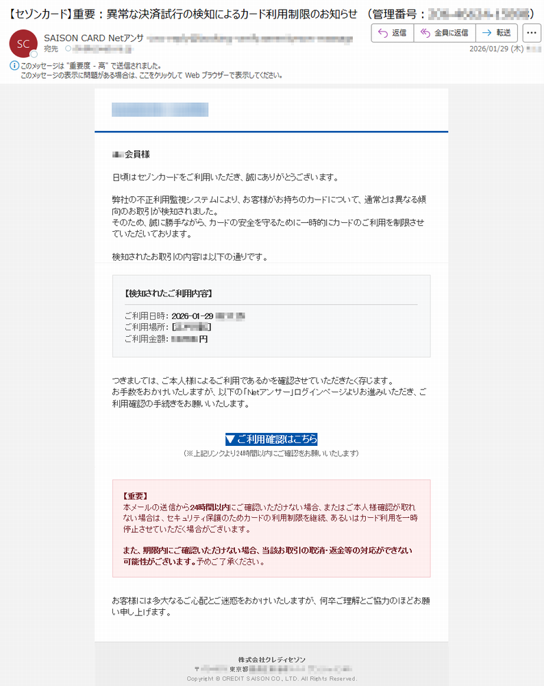 ![SAISONCARDdiv会員様日頃はセゾンカードをご利用いただき、誠にありがとうございます。弊社の不正利用監視システムにより、お客様がお持ちのカードについて、通常とは異なる傾向のお取引が検知されました。そのため、誠に勝手ながら、カードの安全を守るために一時的にカードのご利用を制限させていただいております。検知されたお取引の内容は以下の通りです。【検知されたご利用内容】ご利用日時:2026-01-29*****ご利用場所:[*****]ご利用金額:*****円つきましては、ご本人様によるご利用であるかを確認させていただきたく存じます。お手数をおかけいたしますが、以下の「Netアンサー」ログインページよりお進みいただき、ご利用確認の手続きをお願いいたします。▼ご利用確認はこちら(※上記リンクより24時間以内にご確認をお願いいたします)【重要】本メールの送信から24時間以内にご確認いただけない場合、またはご本人様確認が取れない場合は、セキュリティ保護のためカードの利用制限を継続、あるいはカード利用を一時停止させていただく場合がございます。また、期限内にご確認いただけない場合、当該お取引の取消・返金等の対応ができない可能性がございます。予めご了承ください。お客様には多大なるご心配とご迷惑をおかけいたしますが、何卒ご理解とご協力のほどお願い申し上げます。株式会社クレディセゾン〒*****東京都*****Copyright©CREDITSAISONCO.,LTD.AllRightsReserved.](../../../images/alert/2026/1m/nise_mail0129_18.png)