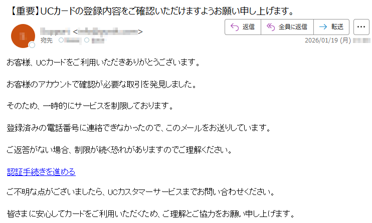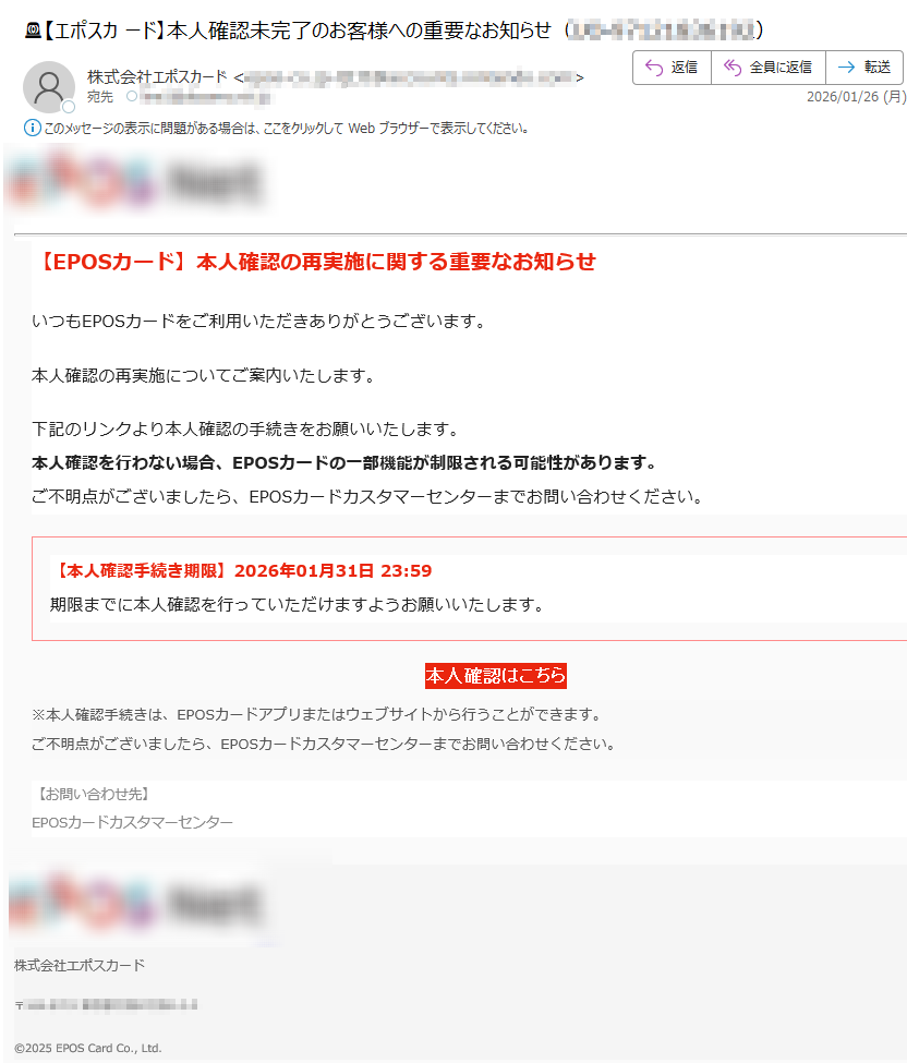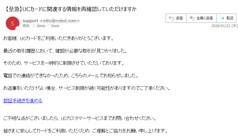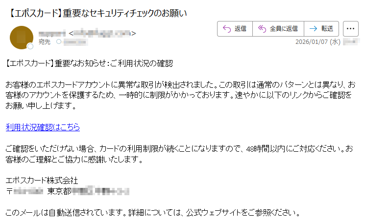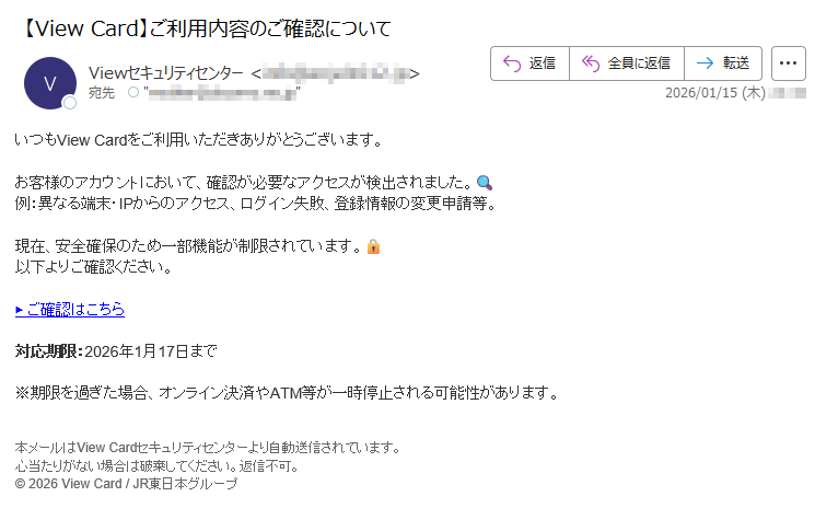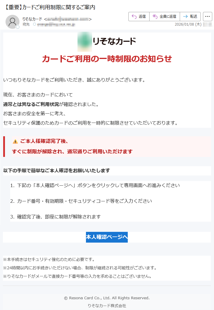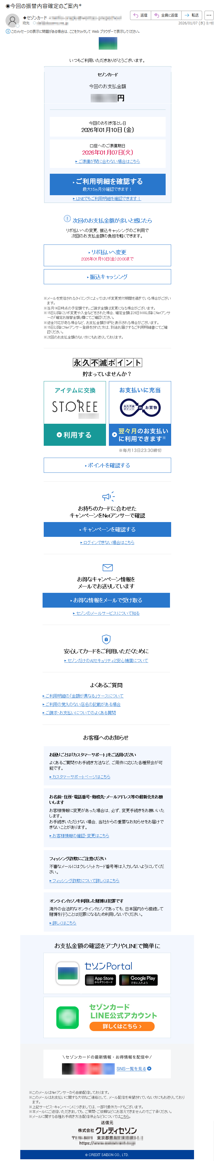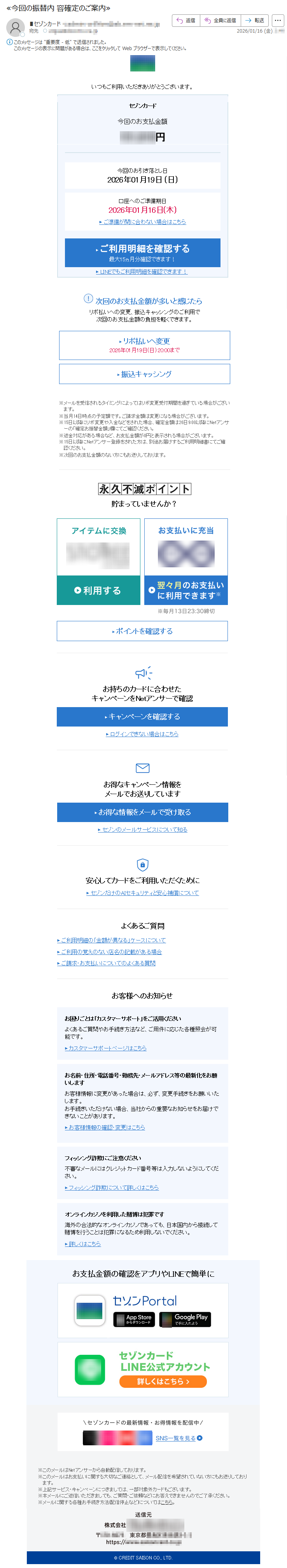 ![SAISONCARDdiv会員様日頃はセゾンカードをご利用いただき、誠にありがとうございます。弊社の不正利用監視システムにより、お客様がお持ちのカードについて、通常とは異なる傾向のお取引が検知されました。そのため、誠に勝手ながら、カードの安全を守るために一時的にカードのご利用を制限させていただいております。検知されたお取引の内容は以下の通りです。【検知されたご利用内容】ご利用日時:2026-01-29*****ご利用場所:[*****]ご利用金額:*****円つきましては、ご本人様によるご利用であるかを確認させていただきたく存じます。お手数をおかけいたしますが、以下の「Netアンサー」ログインページよりお進みいただき、ご利用確認の手続きをお願いいたします。▼ご利用確認はこちら(※上記リンクより24時間以内にご確認をお願いいたします)【重要】本メールの送信から24時間以内にご確認いただけない場合、またはご本人様確認が取れない場合は、セキュリティ保護のためカードの利用制限を継続、あるいはカード利用を一時停止させていただく場合がございます。また、期限内にご確認いただけない場合、当該お取引の取消・返金等の対応ができない可能性がございます。予めご了承ください。お客様には多大なるご心配とご迷惑をおかけいたしますが、何卒ご理解とご協力のほどお願い申し上げます。株式会社クレディセゾン〒*****東京都*****Copyright©CREDITSAISONCO.,LTD.AllRightsReserved.](../../../images/alert/2026/1m/nise_mail0129_18.png)