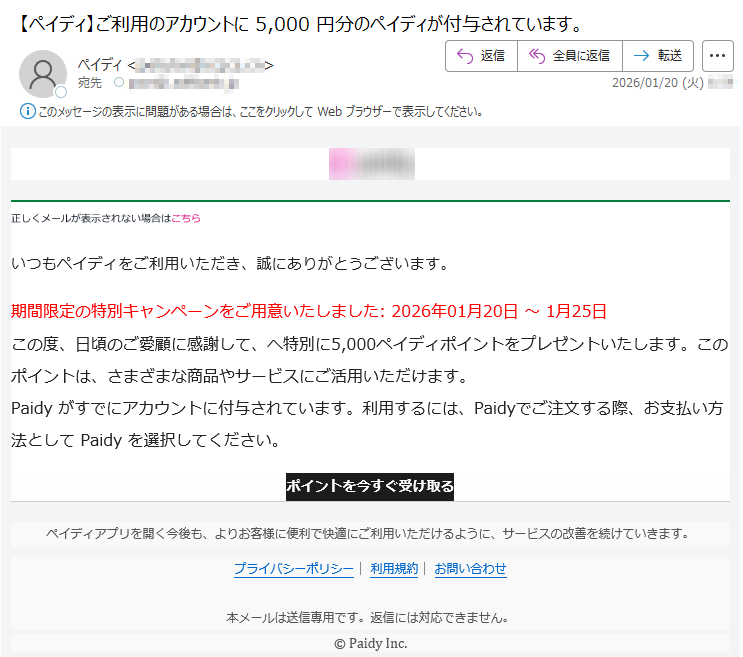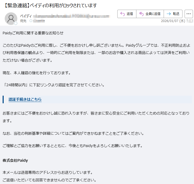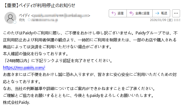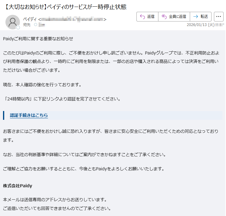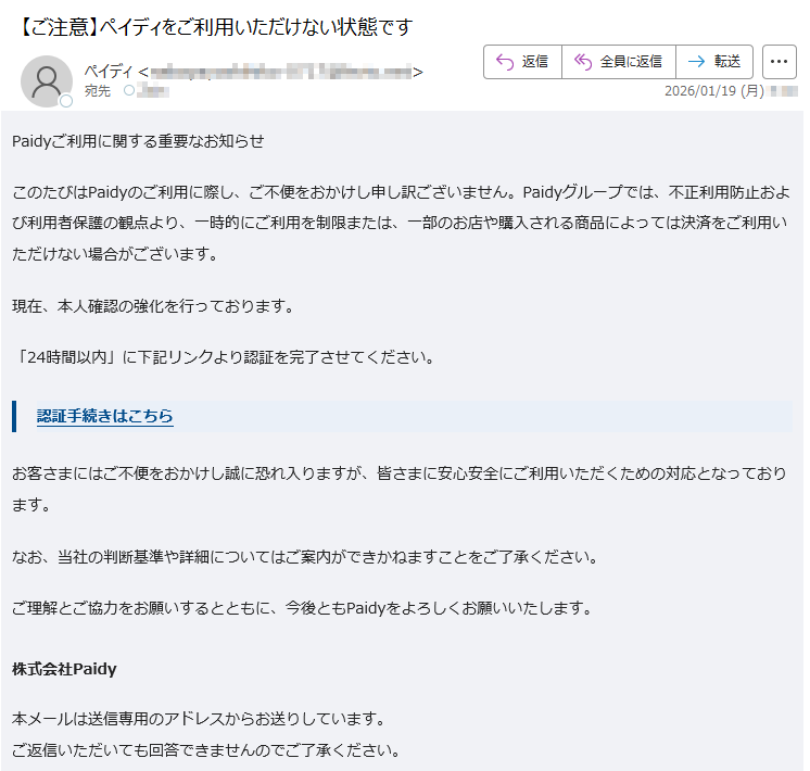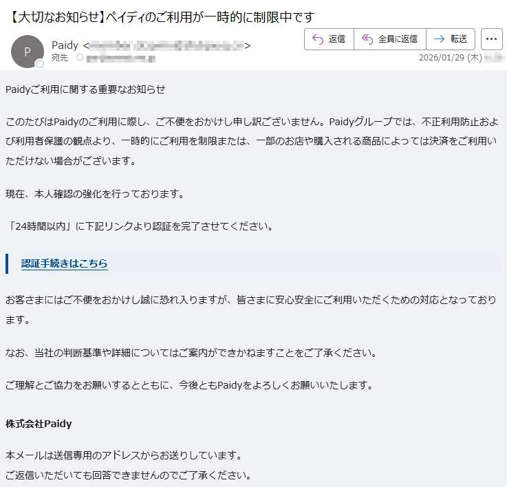 ペイディになりすました偽メール「件名:【大切なお知らせ】ペイディのご利用が一時的に制限中です」(本偽メールは、実在の企業と無関係に送信されたものです)