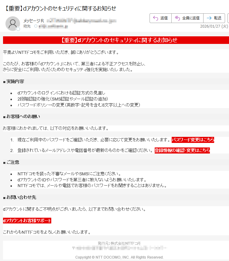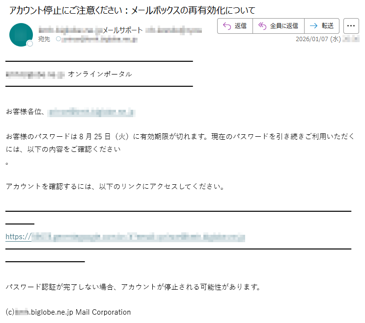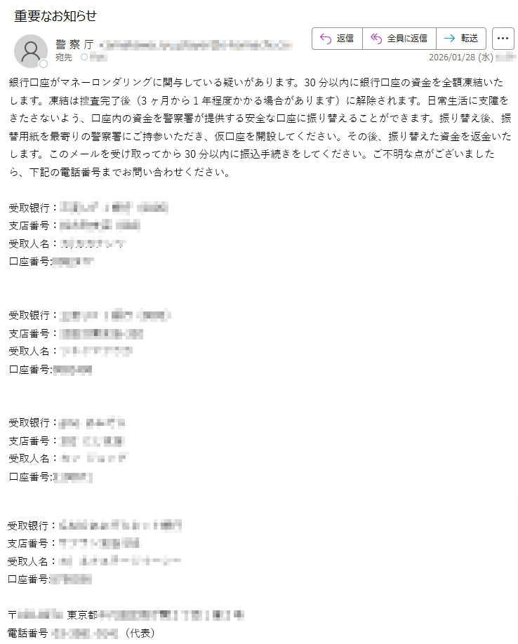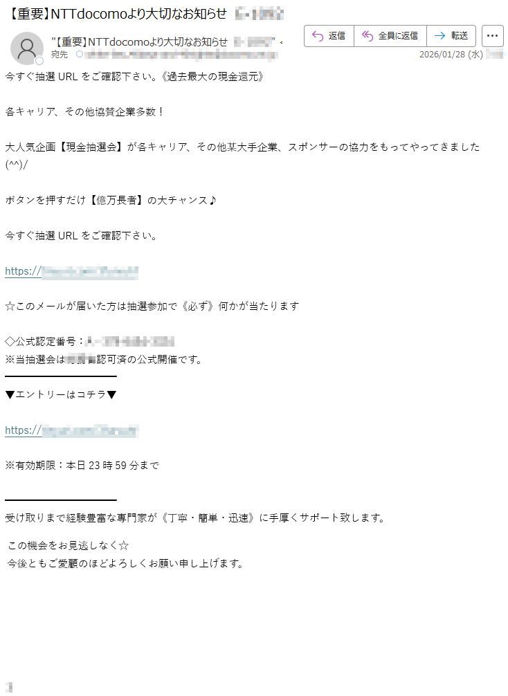 2026年1月28日現在、以下の迷惑メール・詐欺メールが送信されているので気をつけてください。