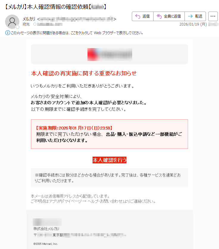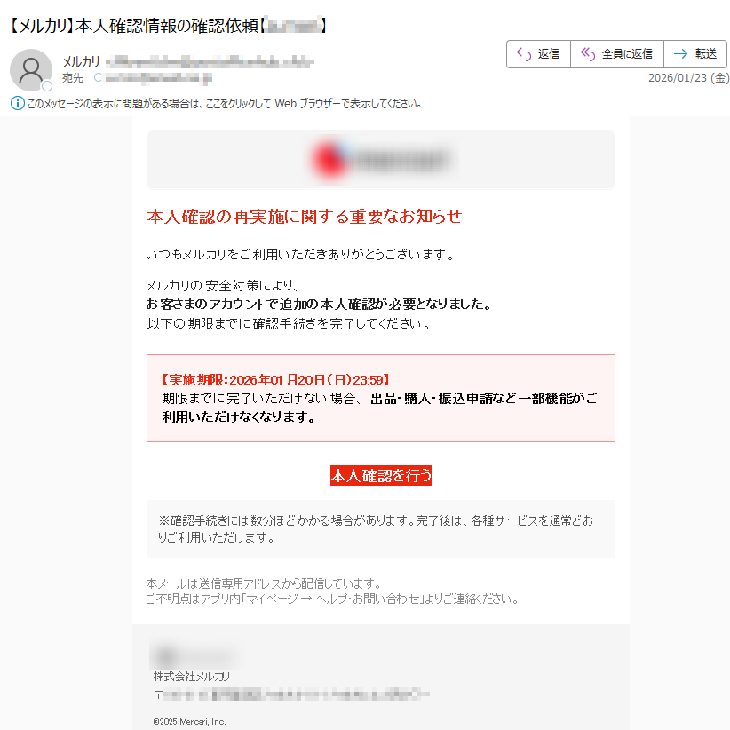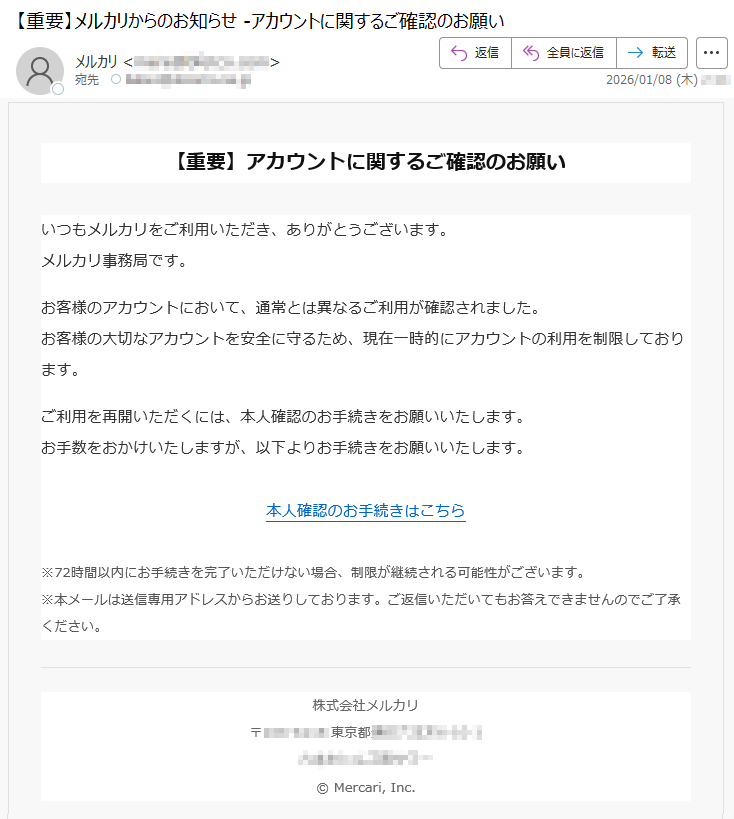 メルカリになりすました偽メール「件名:【メルカリ】アカウント制限のお知らせ」(本偽メールは、実在の企業と無関係に送信されたものです)
