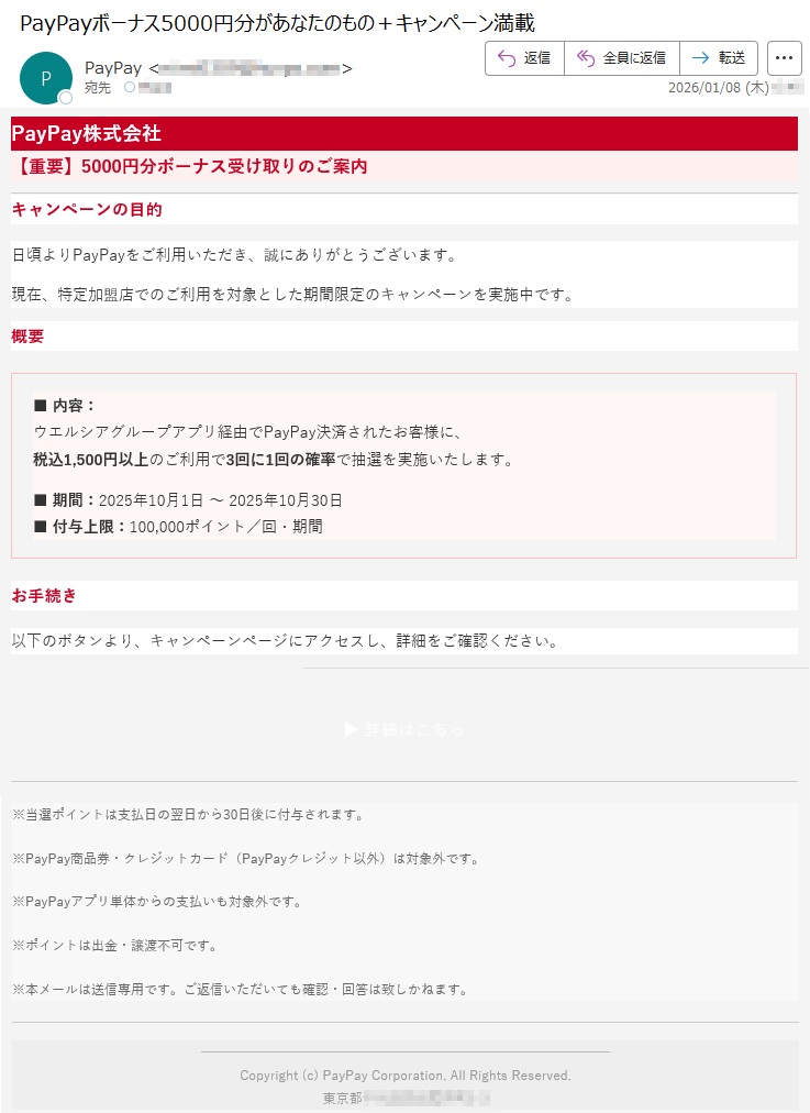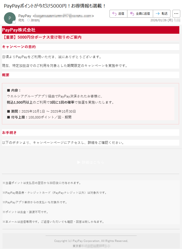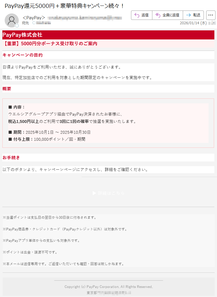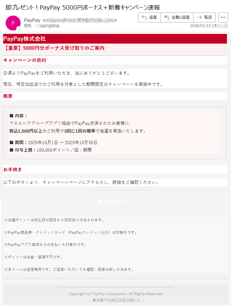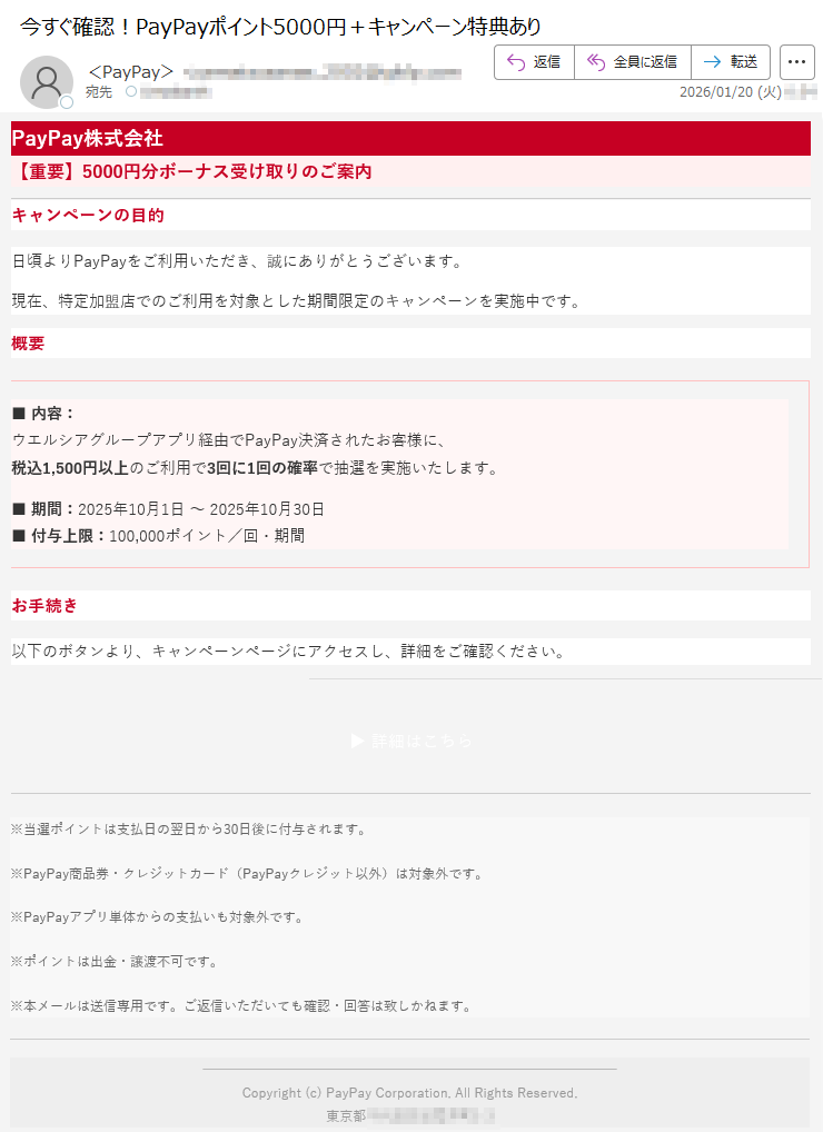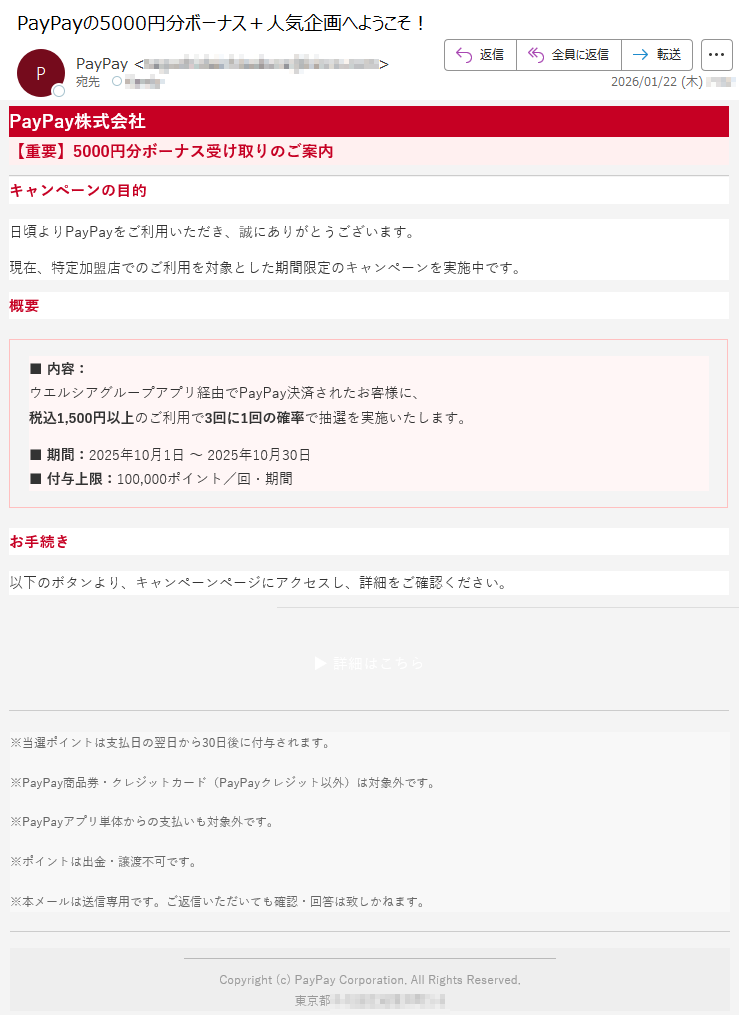 PayPayになりすました偽メール「件名:今すぐアクセス!PayPayボーナス5000円+限定特典あり」(本偽メールは、実在の企業と無関係に送信されたものです)