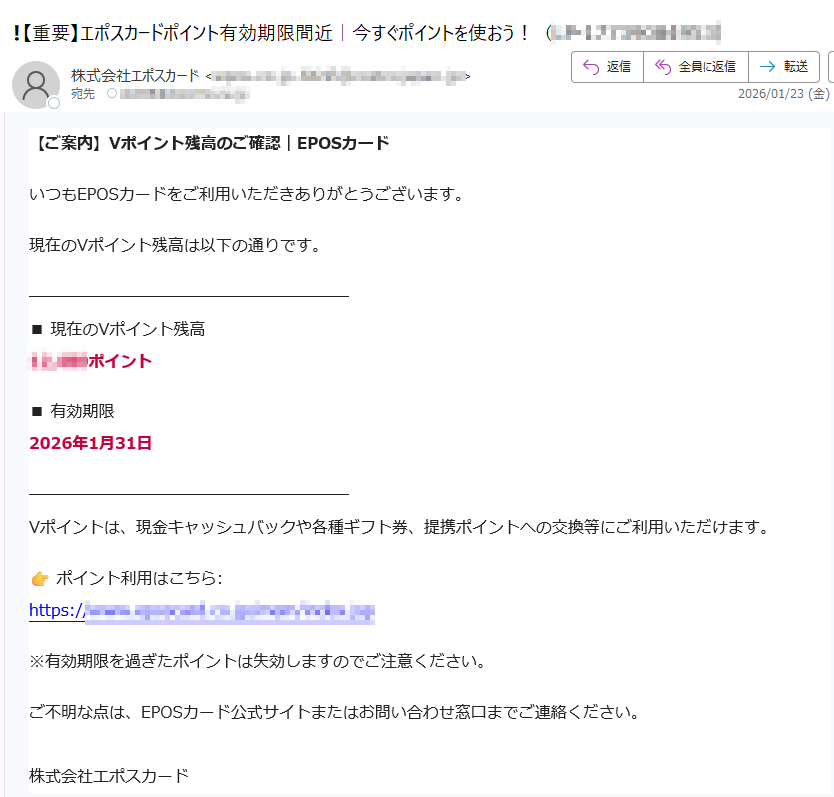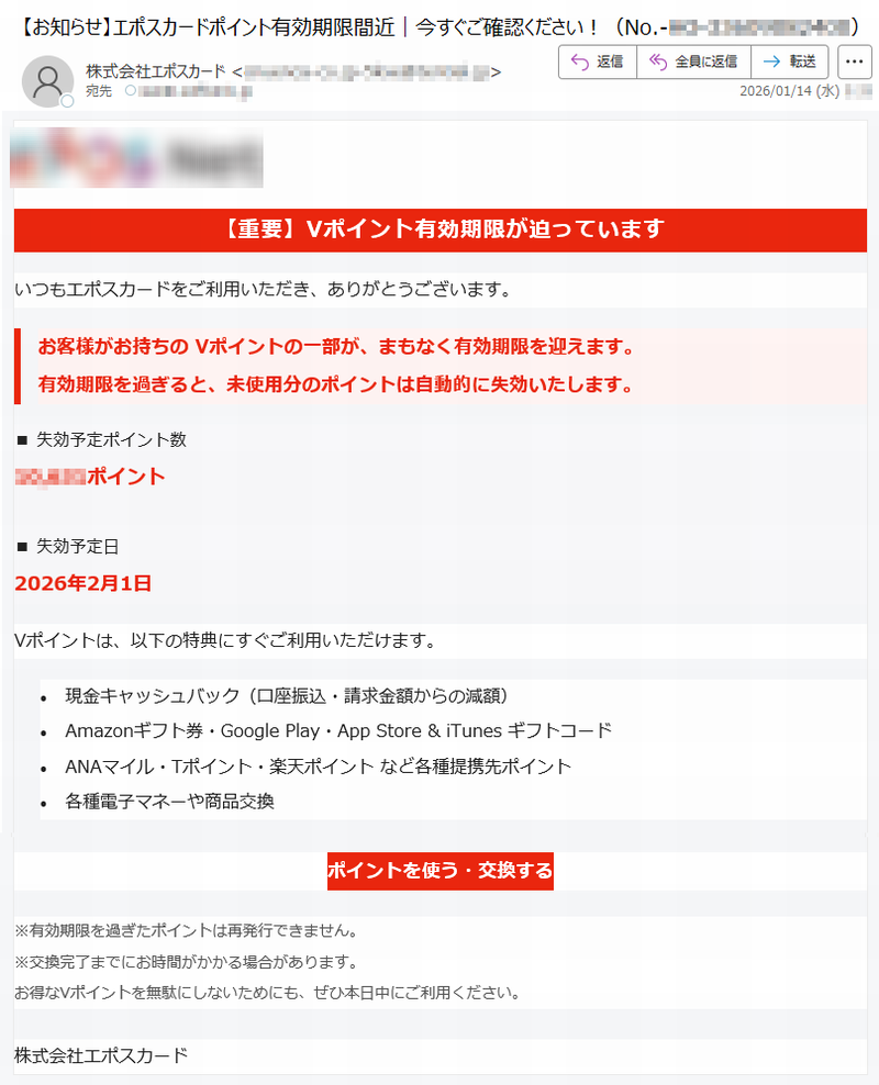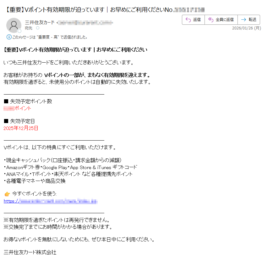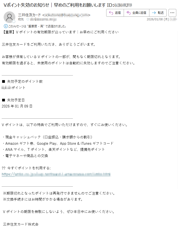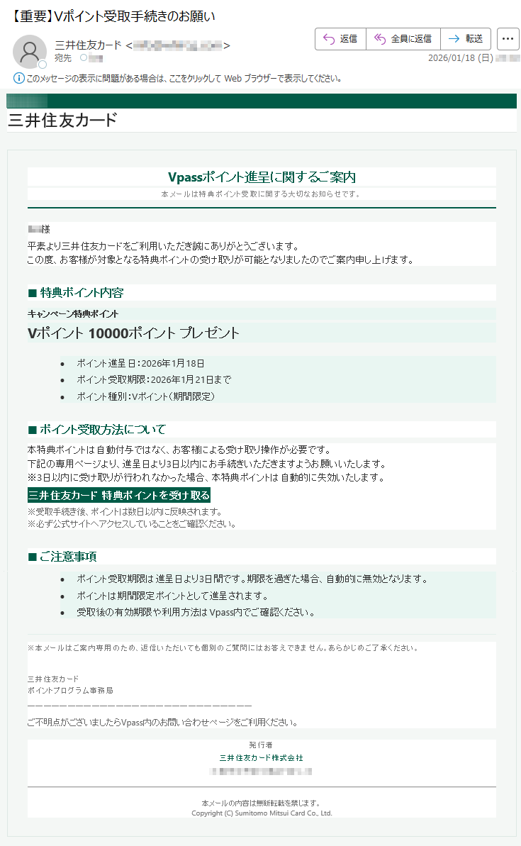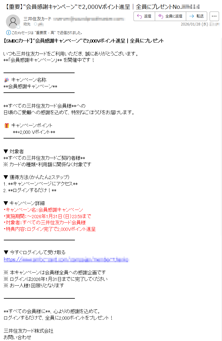 三井住友カードになりすました偽メール「件名:【重要】"会員感謝キャンペーン"で2,000Vポイント進呈|全員にプレゼントNo.*****」(本偽メールは、実在の企業と無関係に送信されたものです)
