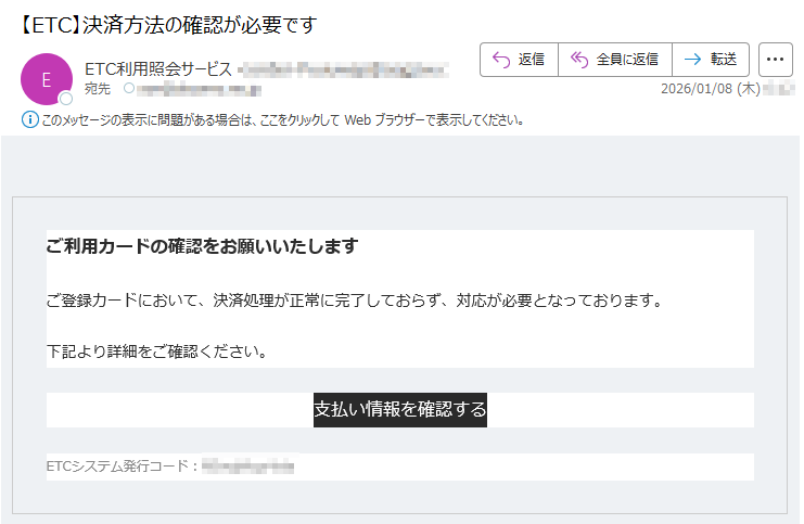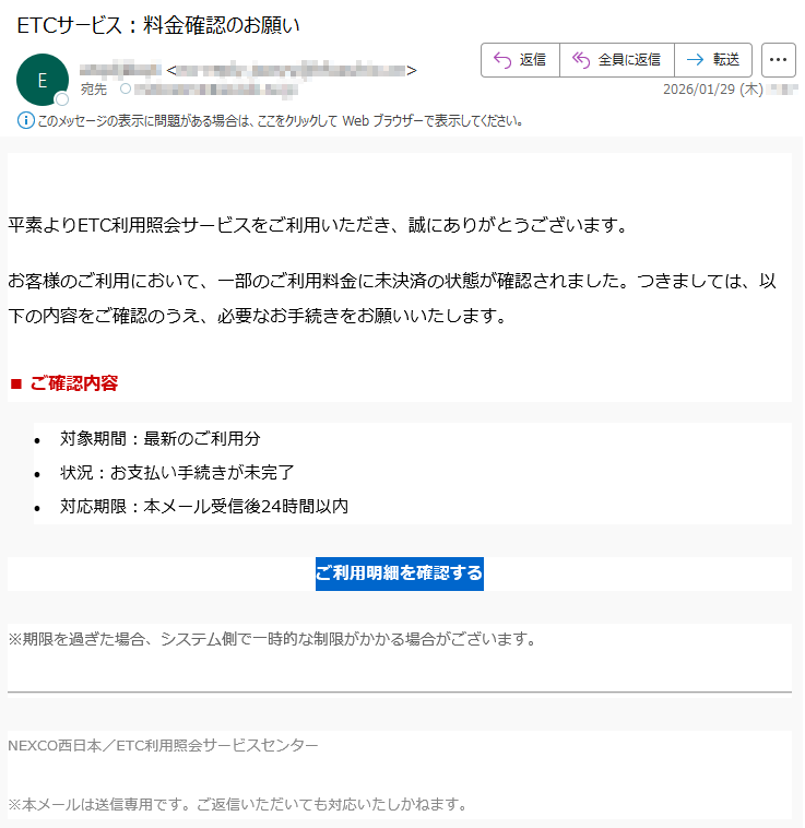 ETC利用照会サービスになりすました偽メール「件名:ETCサービス:料金確認のお願い」(本偽メールは、実在の企業と無関係に送信されたものです)