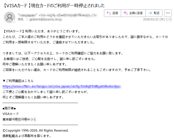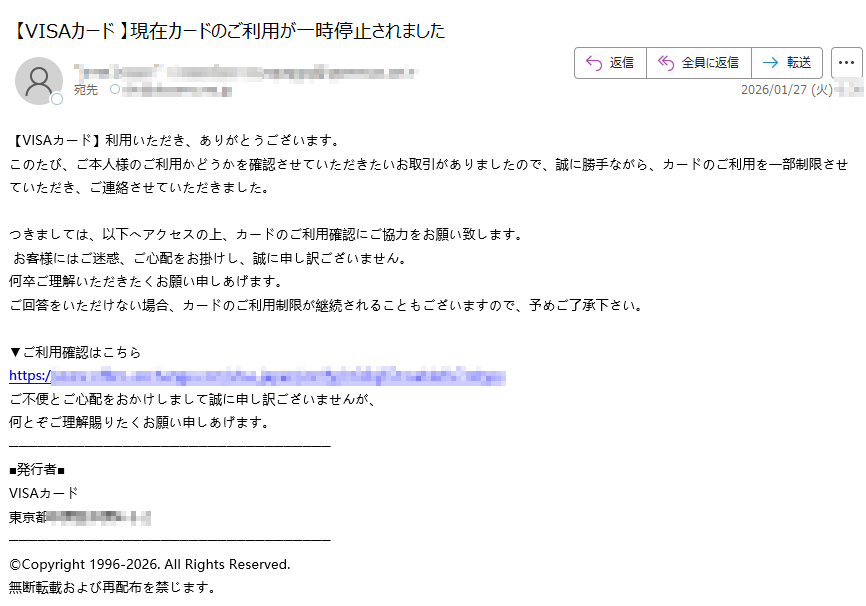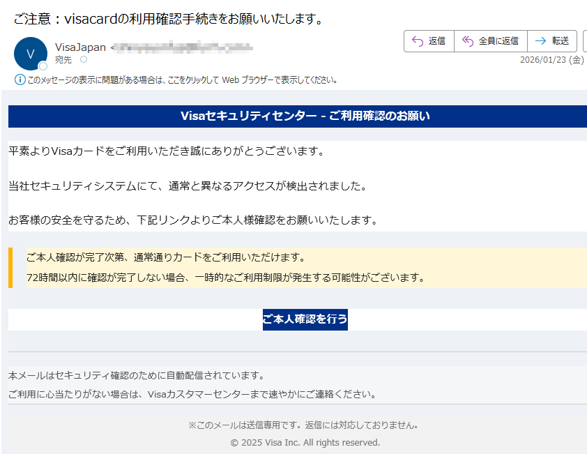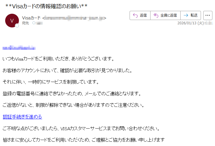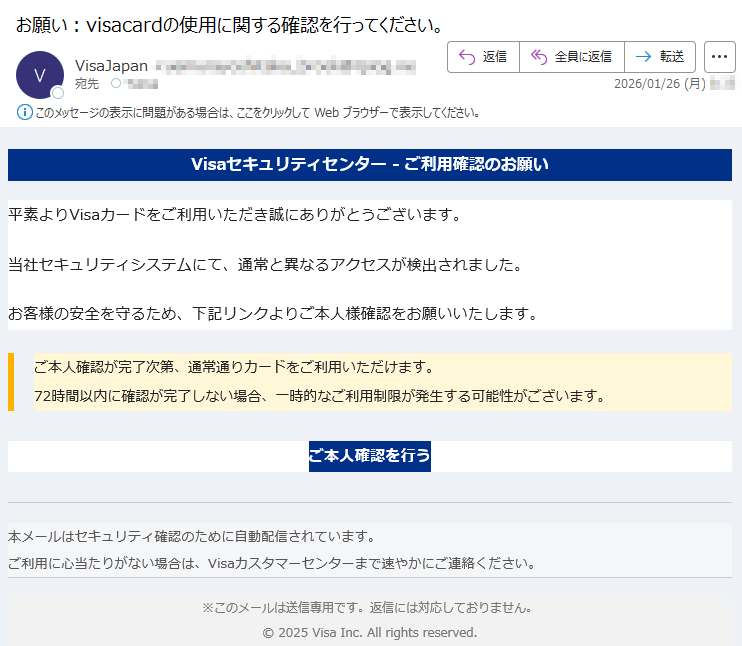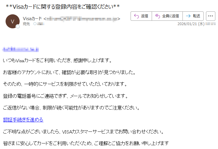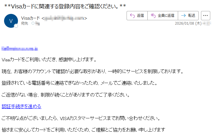 VISAカードになりすました偽メール「件名:**Visaカードの情報登録状況をご確認ください。**」(本偽メールは、実在の企業と無関係に送信されたものです)