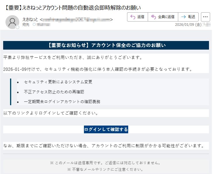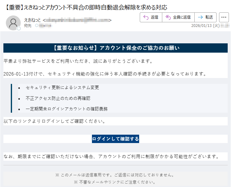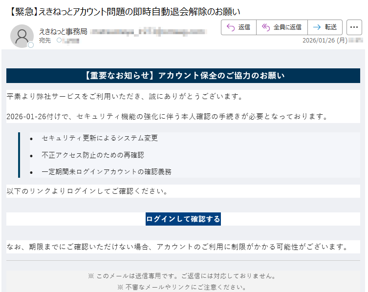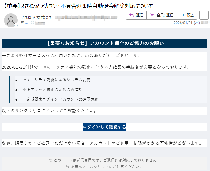 えきねっとになりすました偽メール「件名:【急務】えきねっとアカウント不具合の即時自動退会解除を求める対応」(本偽メールは、実在の企業と無関係に送信されたものです)