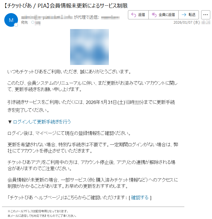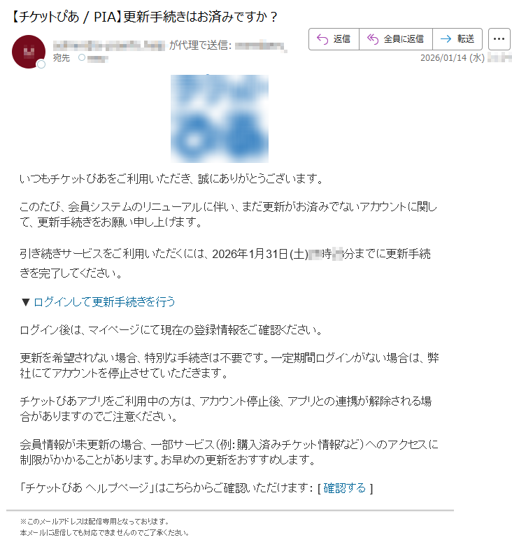 ![いつもチケットぴあをご利用いただき、誠にありがとうございます。このたび、会員システムのリニューアルに伴い、まだ更新がお済みでないアカウントに関して、更新手続きをお願い申し上げます。引き続きサービスをご利用いただくには、2026年1月31日(土)**時**分までに更新手続きを完了してください。▼ログインして更新手続きを行うログイン後は、マイページにて現在の登録情報をご確認ください。更新を希望されない場合、特別な手続きは不要です。一定期間ログインがない場合は、弊社にてアカウントを停止させていただきます。チケットぴあアプリをご利用中の方は、アカウント停止後、アプリとの連携が解除される場合がありますのでご注意ください。会員情報が未更新の場合、一部サービス(例:購入済みチケット情報など)へのアクセスに制限がかかることがあります。お早めの更新をおすすめします。「チケットぴあヘルプページ」はこちらからご確認いただけます:[確認する]※このメールアドレスは配信専用となっております。本メールに返信しても対応できませんのでご了承ください。](../../../images/alert/2026/1m/nise_mail0122_02.png)