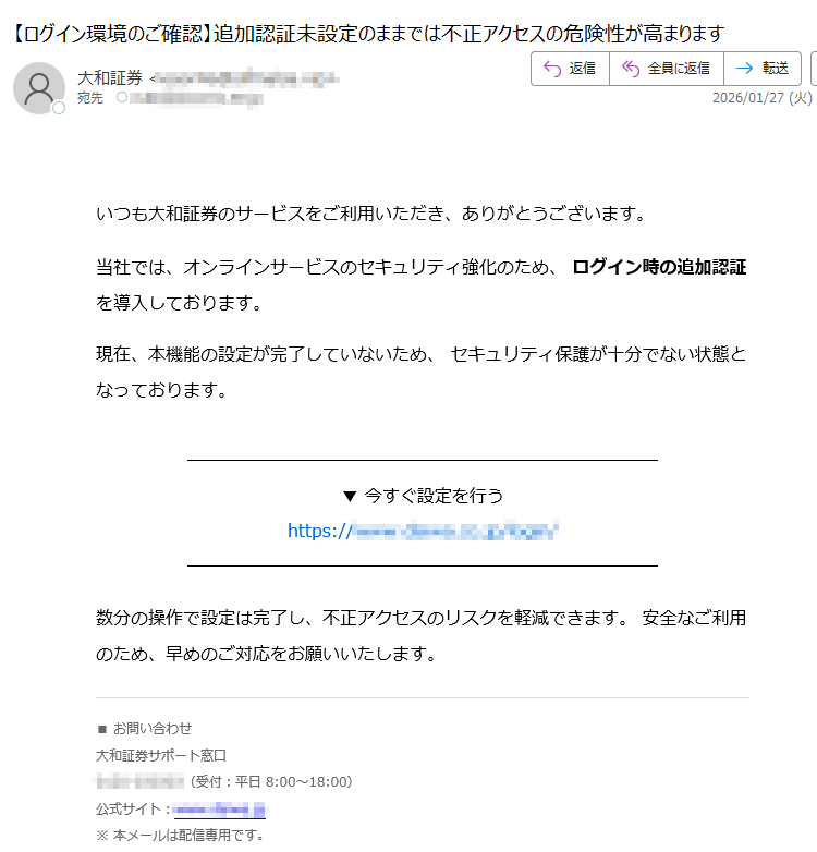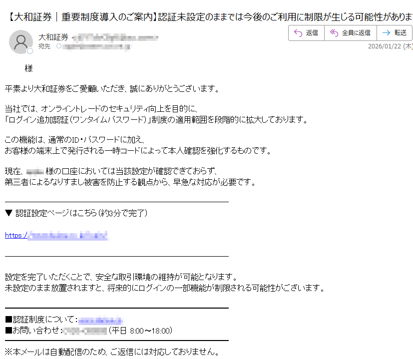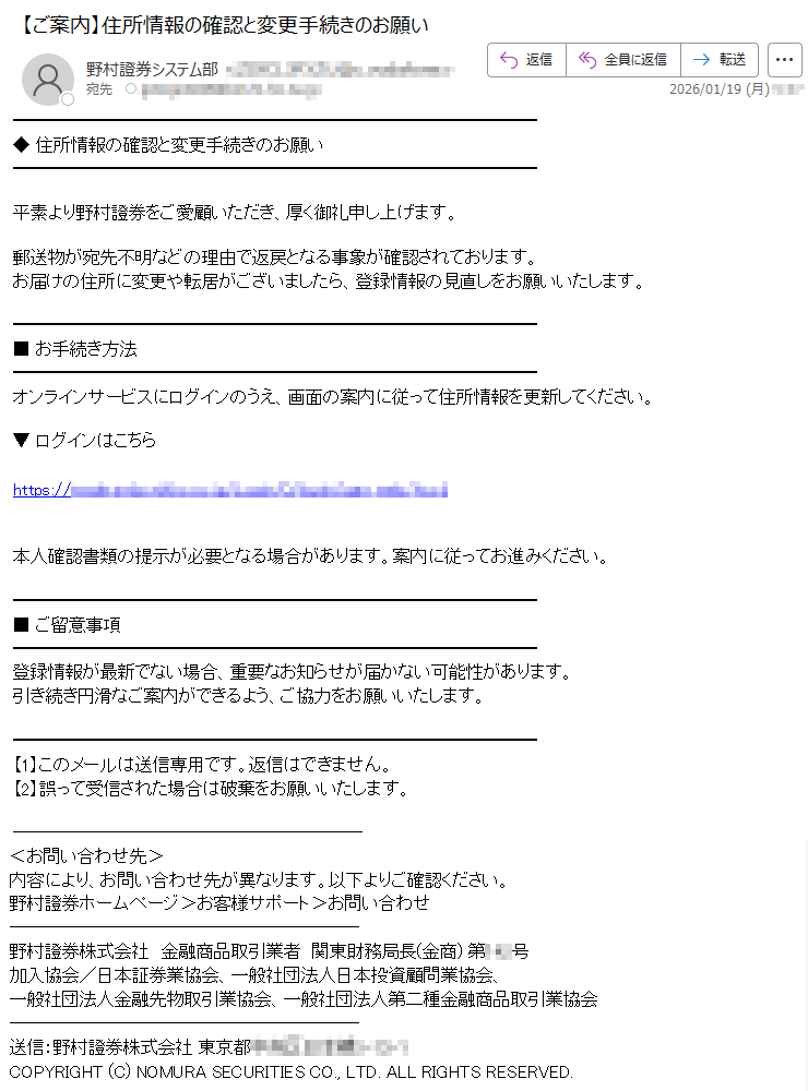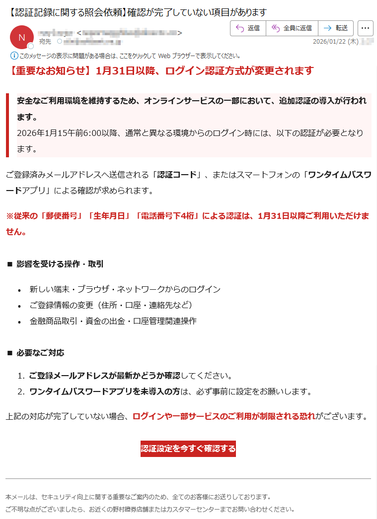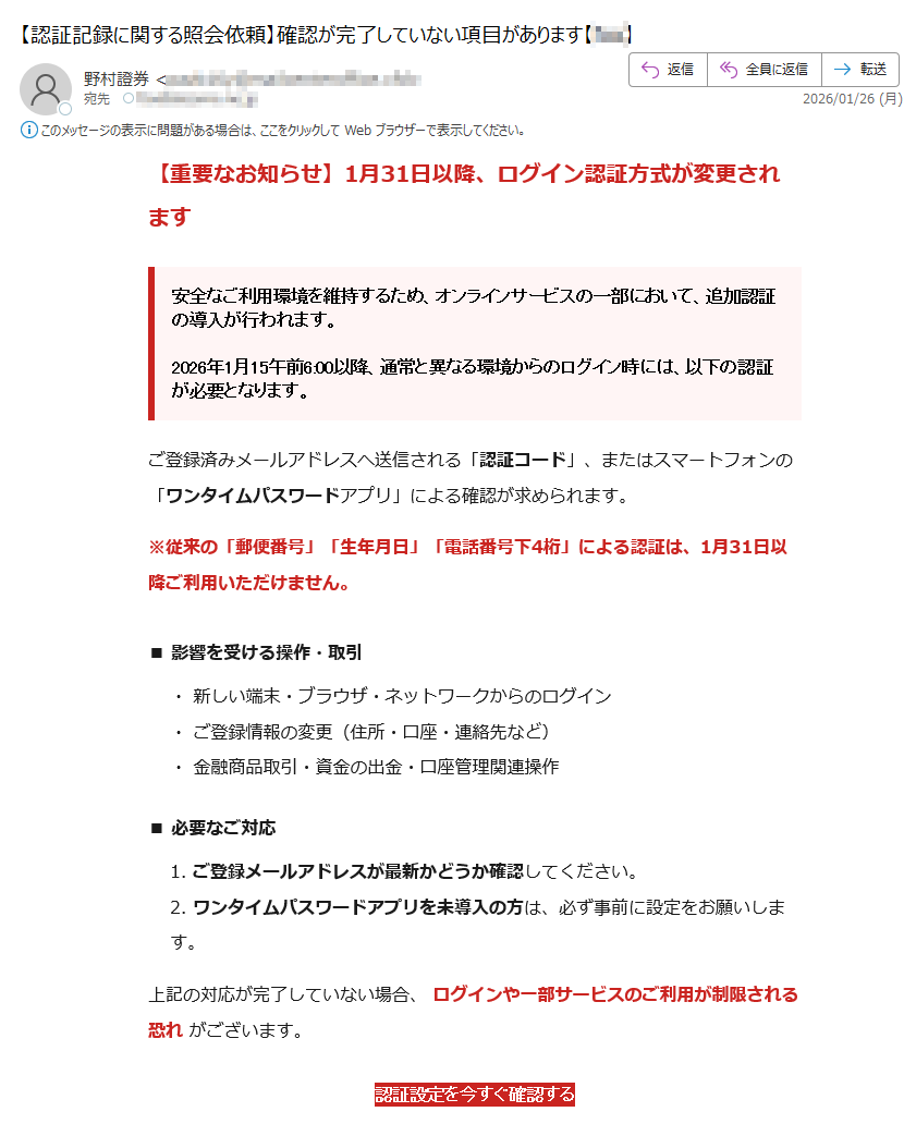 野村證券になりすました偽メール「件名:【重要なお知らせ】1月31日以降、ログイン認証方式が変更されます【****】」(本偽メールは、実在の企業と無関係に送信されたものです)