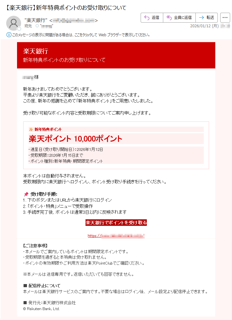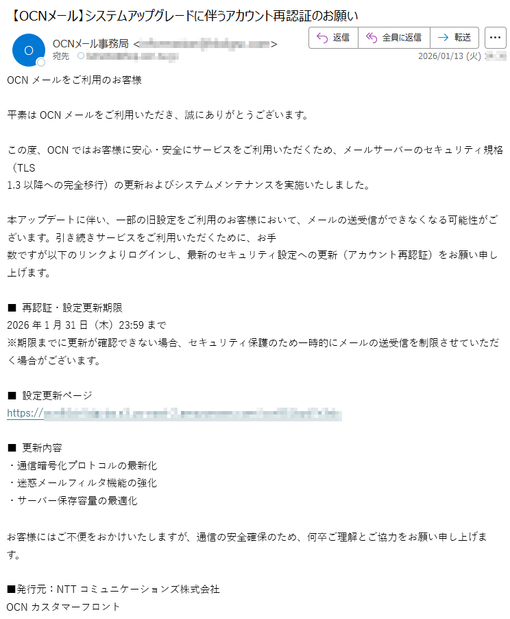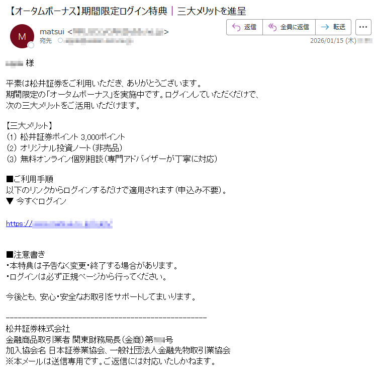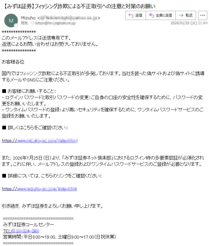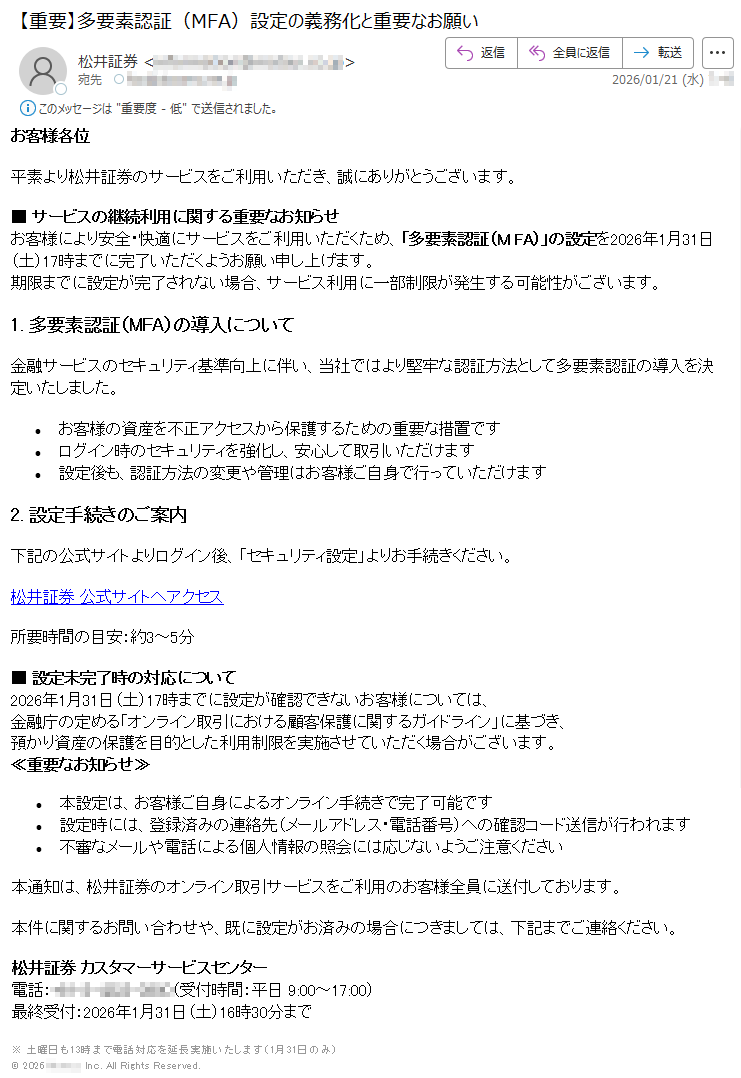 野村證券になりすました偽メール「件名:【重要なお知らせ】1月31日以降、ログイン認証方式が変更されます【****】」(本偽メールは、実在の企業と無関係に送信されたものです)