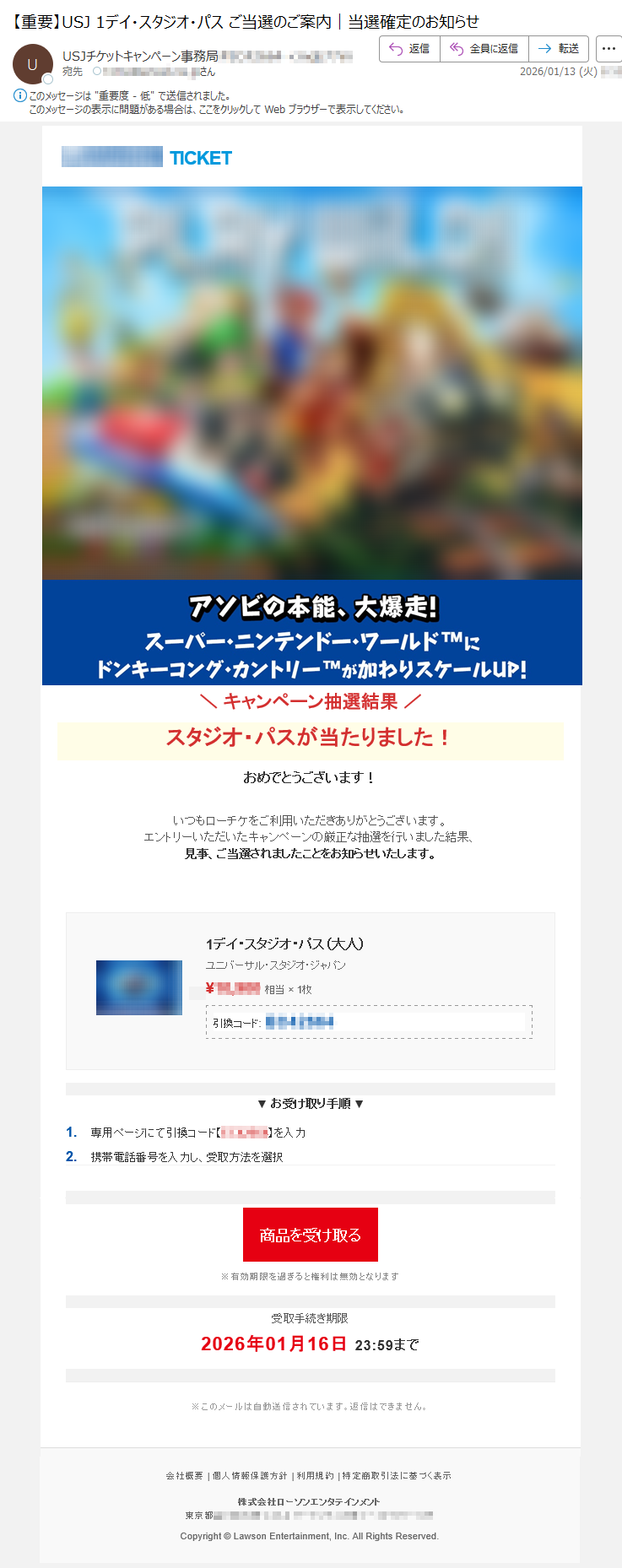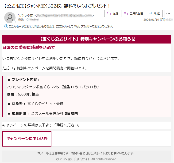 宝くじ公式サイトになりすました偽メール「件名:【数量限定】ジャンボ宝くじ22枚、今だけ無料配布!」(本偽メールは、実在の企業と無関係に送信されたものです)