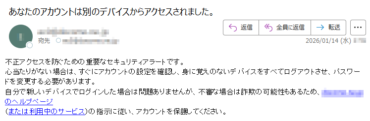 「別のデバイスからアクセスされた」としてアカウントにログインを要求するメール「件名:あなたのアカウントは別のデバイスからアクセスされました。」