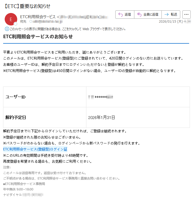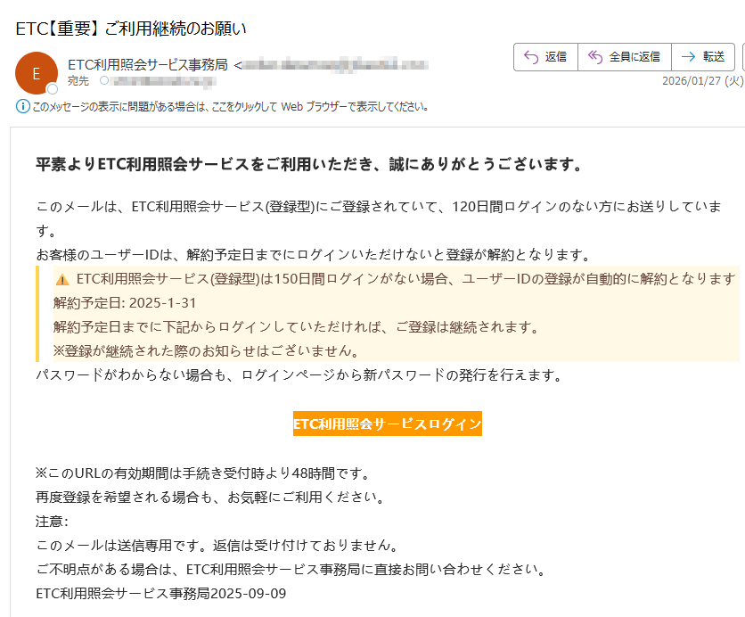ETC利用照会サービスになりすました偽メール「件名:【重要】ETCサービス本人確認手続」(本偽メールは、実在の企業と無関係に送信されたものです)