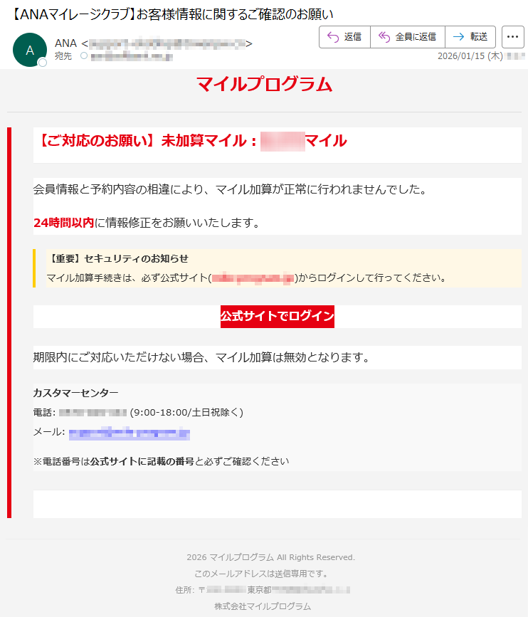 ANAマイレージクラブになりすました偽メール「件名:マイル加算手続きについてのお知らせ(ANAマイレージクラブ)。」(本偽メールは、実在の企業と無関係に送信されたものです)