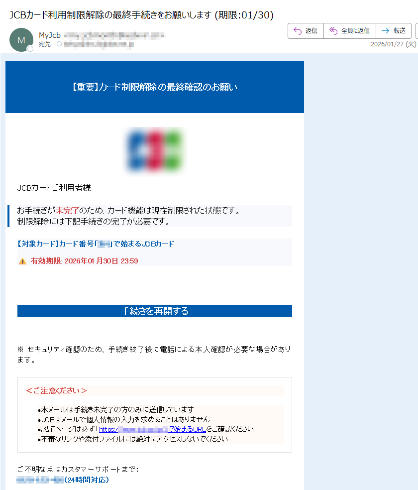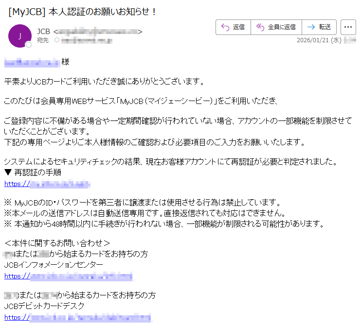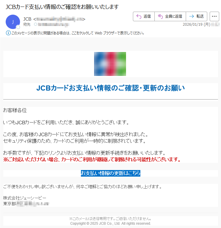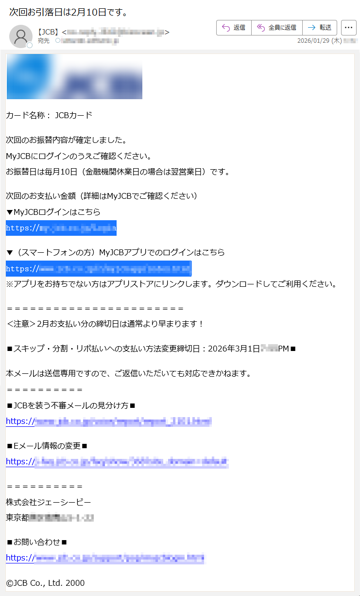 JCBカードになりすました偽メール「件名:次回お引落日は2月10日です。」(本偽メールは、実在の企業と無関係に送信されたものです)