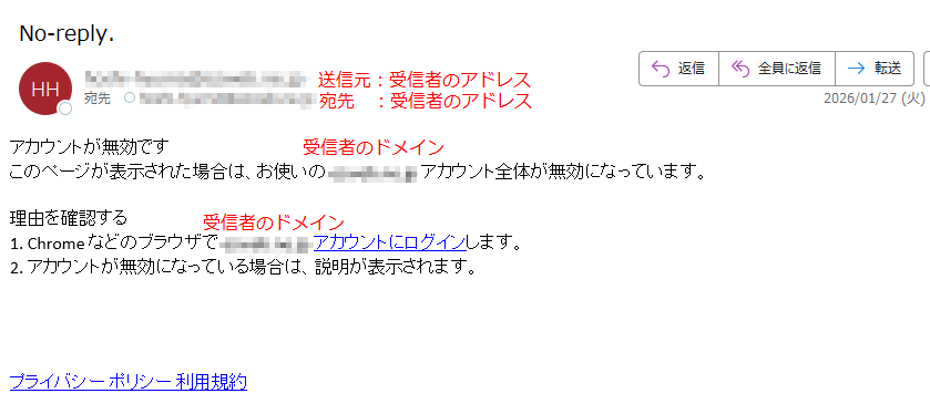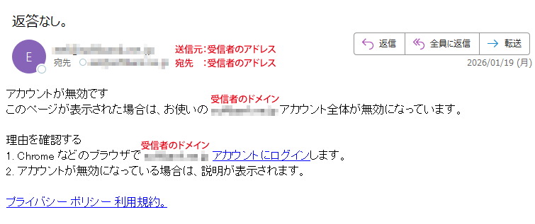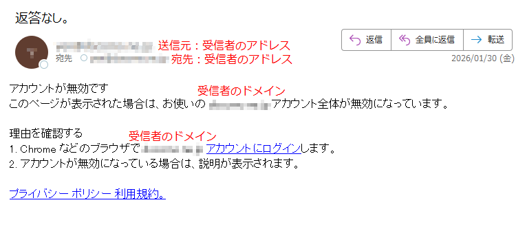 「アカウントが無効」としてアカウントにログインを要求するメール「件名:返答なし。」