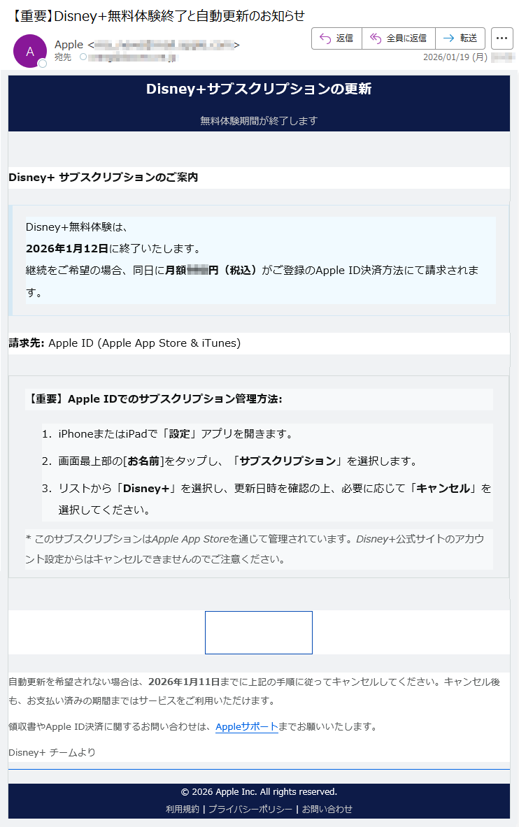 ![Disney+サブスクリプションの更新無料体験期間が終了しますDisney+サブスクリプションのご案内Disney+無料体験は、2026年1月12日に終了いたします。継続をご希望の場合、同日に月額***円(税込)がご登録のAppleID決済方法にて請求されます。請求先:AppleID(AppleAppStore&iTunes)【重要】AppleIDでのサブスクリプション管理方法:1.iPhoneまたはiPadで「設定」アプリを開きます。2.画面最上部の[お名前]をタップし、「サブスクリプション」を選択します。3.リストから「Disney+」を選択し、更新日時を確認の上、必要に応じて「キャンセル」を選択してください。*このサブスクリプションはAppleAppStoreを通じて管理されています。Disney+公式サイトのアカウント設定からはキャンセルできませんのでご注意ください。設定アプリを開く自動更新を希望されない場合は、2026年1月11日までに上記の手順に従ってキャンセルしてください。キャンセル後も、お支払い済みの期間まではサービスをご利用いただけます。領収書やAppleID決済に関するお問い合わせは、Appleサポートまでお願いいたします。Disney+チームより©2026AppleInc.Allrightsreserved.利用規約|プライバシーポリシー|お問い合わせ](../../../images/alert/2026/1m/nise_mail0120_03.png)
