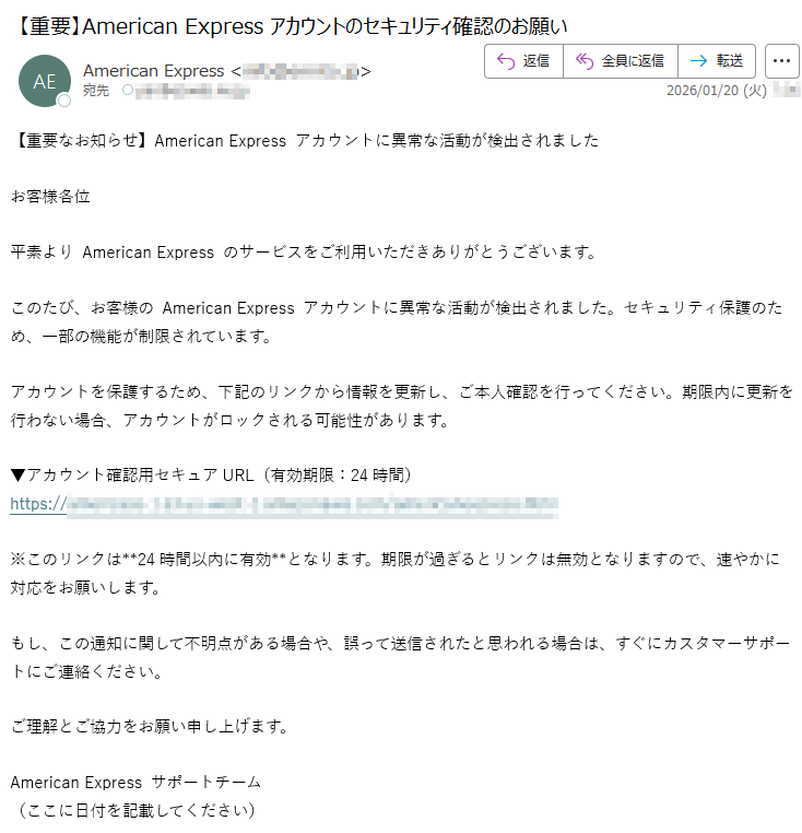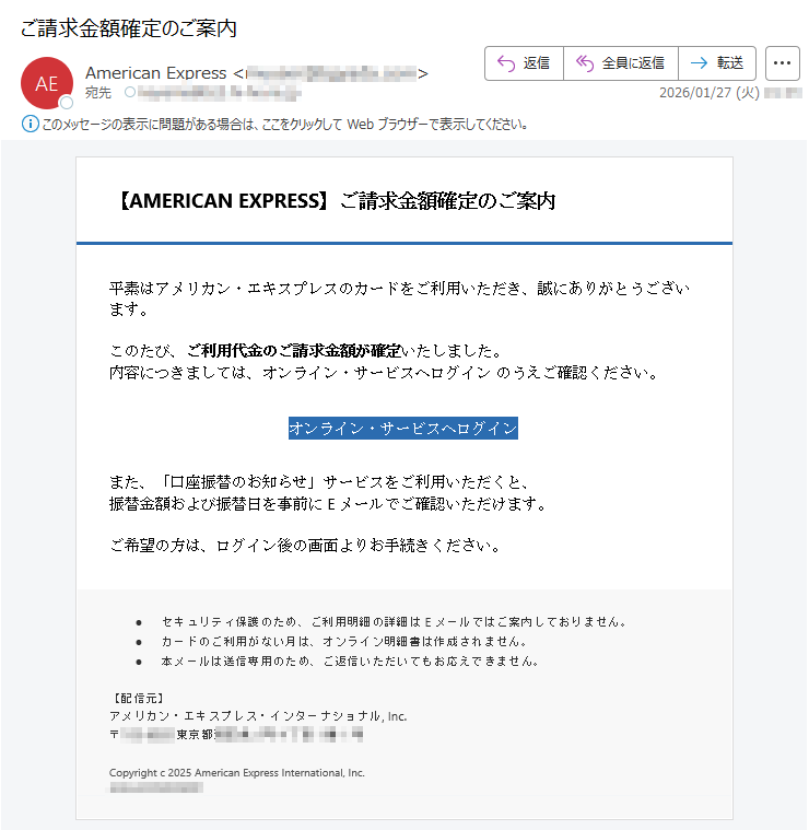 アメリカン・エキスプレス・カードになりすました偽メール「件名:[AMERICAN EXPRESS] ご請求金額確定のご案内」(本偽メールは、実在の企業と無関係に送信されたものです)