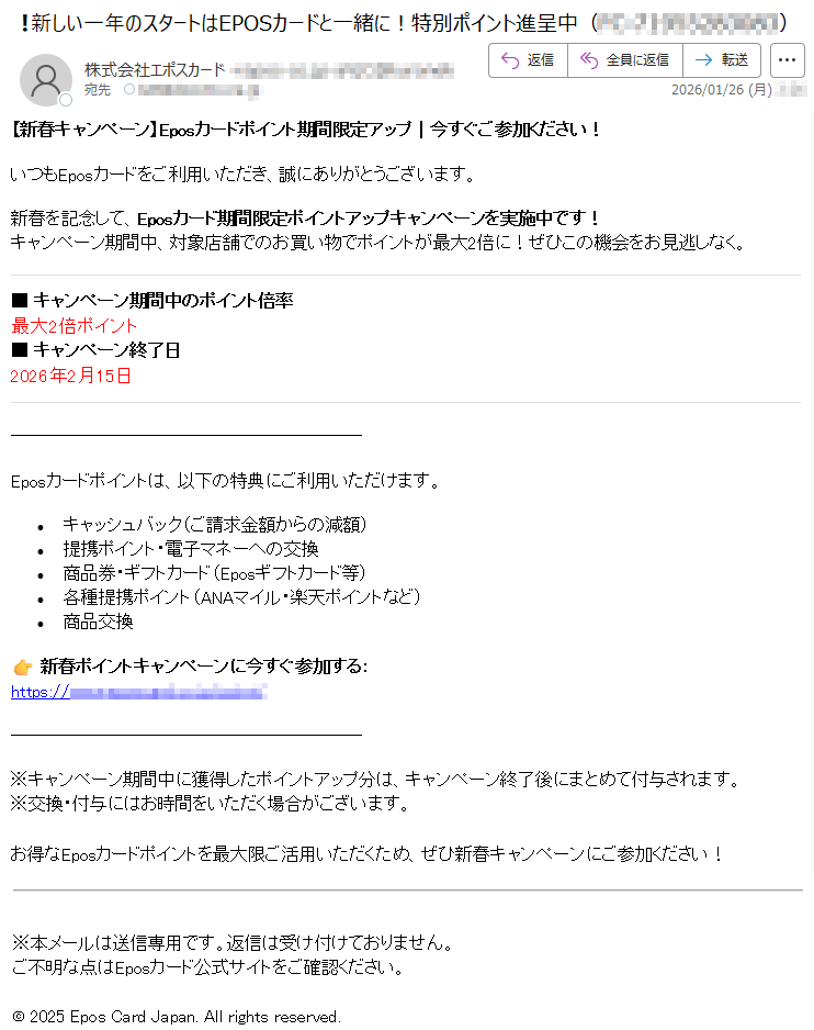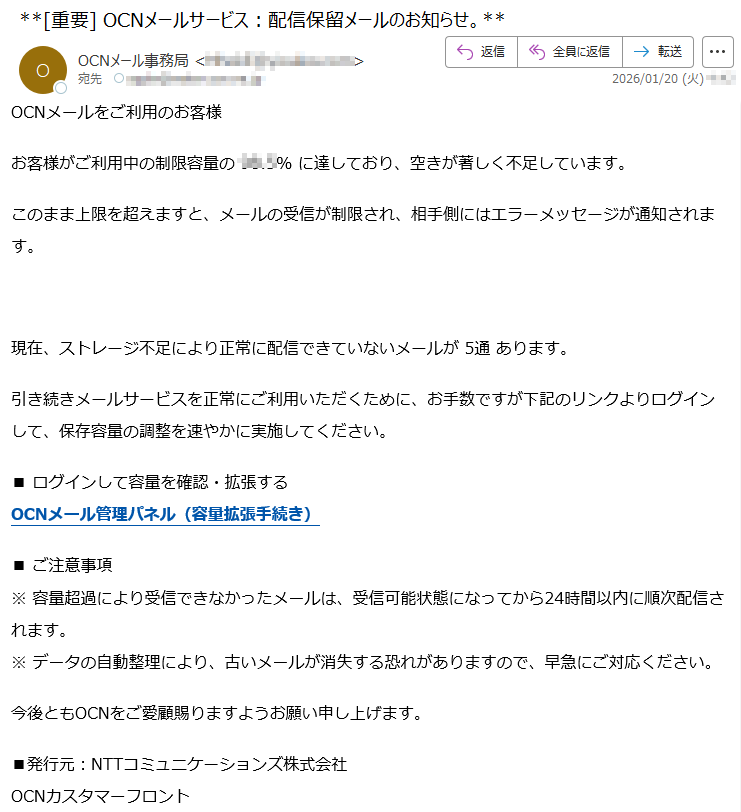 2026年1月30日現在、以下の迷惑メール・詐欺メールが送信されているので気をつけてください。