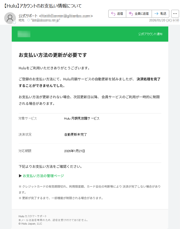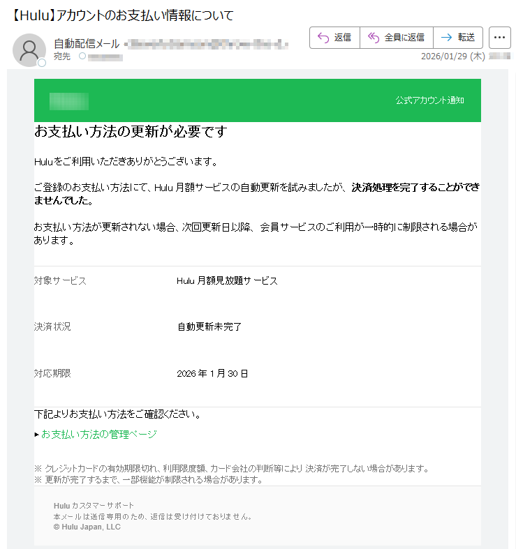 Huluになりすました偽メール「件名:【Hulu】アカウントのお支払い情報について」(本偽メールは、実在の企業と無関係に送信されたものです)