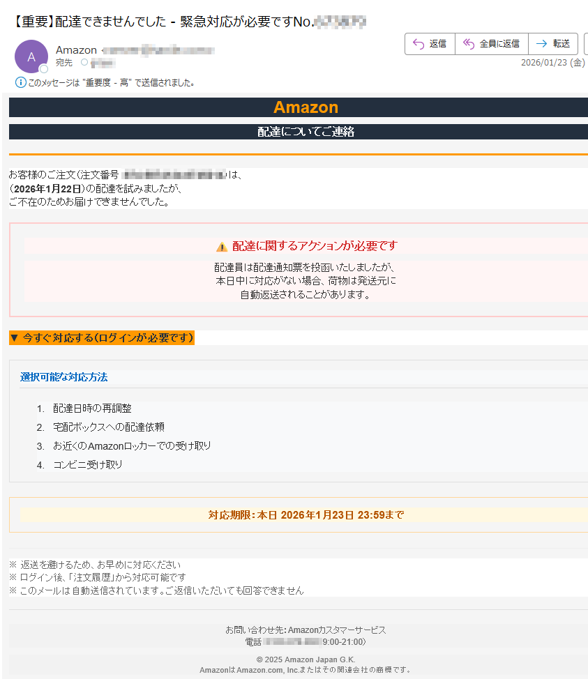 - メール本文中のURL(リンク)はフィッシングサイトへの誘導の可能性が高いため、絶対にクリックしないでください。