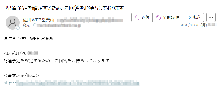 佐川急便になりすました偽メール「件名:配達日程の確定に必要です。在宅可能時間をご連絡ください」(本偽メールは、実在の企業と無関係に送信されたものです)