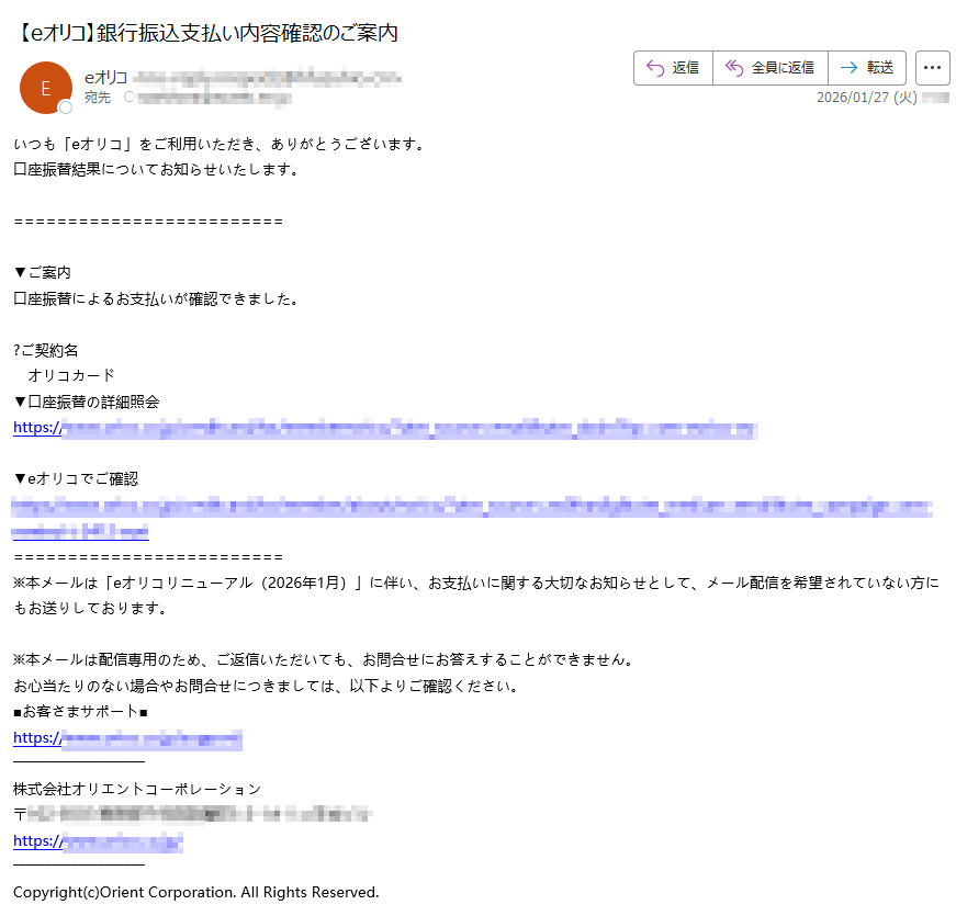 オリコカードになりすました偽メール「件名:eオリコカード口座振替のご確認依頼」(本偽メールは、実在の企業と無関係に送信されたものです)
