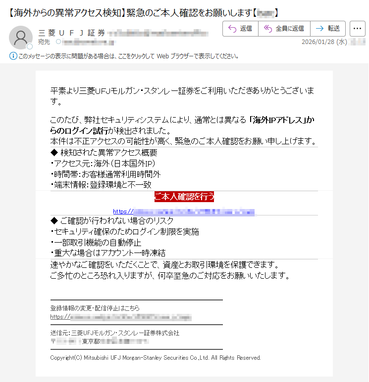 三菱UFJモルガン・スタンレー証券になりすました偽メール「件名:【海外からの異常アクセス検知】緊急のご本人確認をお願いします【****】」(本偽メールは、実在の企業と無関係に送信されたものです)