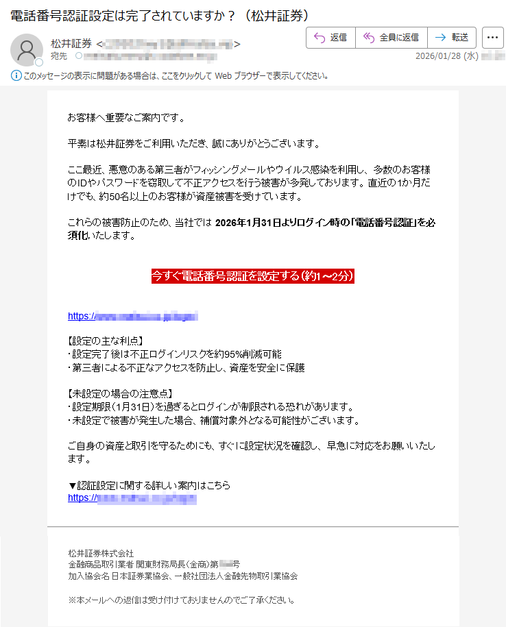 松井証券になりすました偽メール「件名:電話番号認証設定は完了されていますか?(松井証券)」(本偽メールは、実在の企業と無関係に送信されたものです)