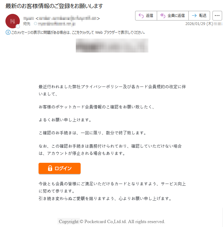 ポケットカードになりすました偽メール「件名:最新のお客様情報のご登録をお願いします」(本偽メールは、実在の企業と無関係に送信されたものです)