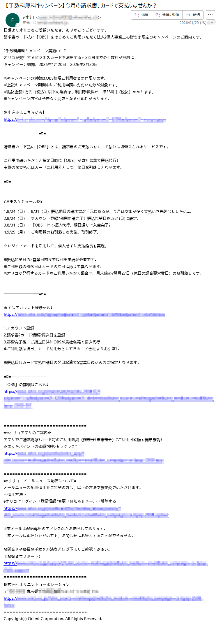 オリコカードになりすました偽メール「件名:【手数料無料キャンペーン】今月の請求書、カードで支払いませんか?」(本偽メールは、実在の企業と無関係に送信されたものです)