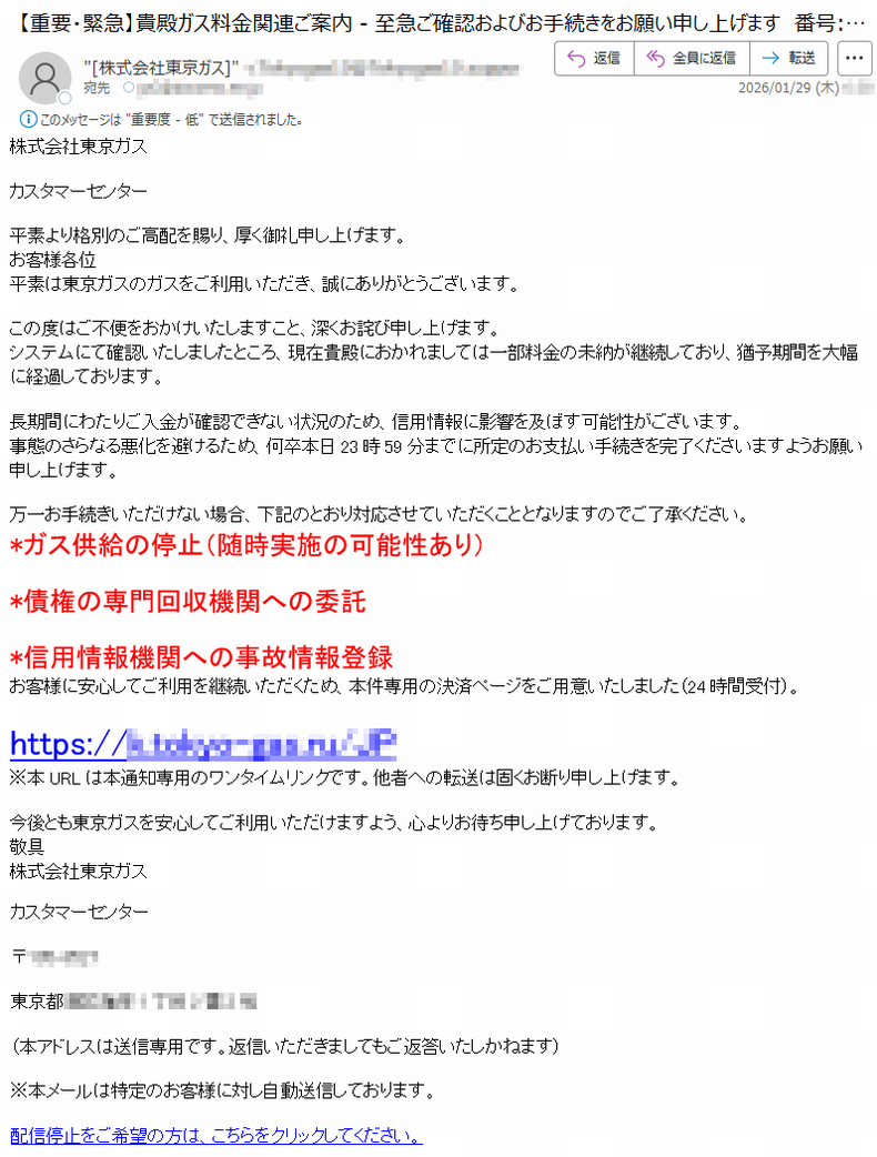 東京ガスになりすました偽メール「件名:【重要・緊急】貴殿ガス料金関連ご案内 - 至急ご確認およびお手続きをお願い申し上げます 番号:*****」(本偽メールは、実在の企業と無関係に送信されたものです)