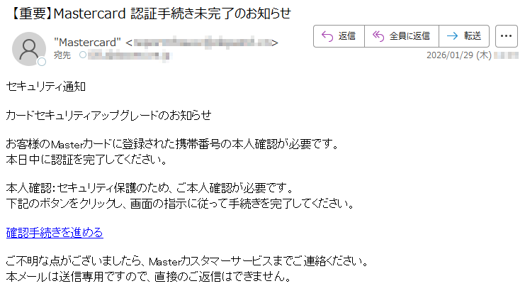 マスターカードになりすました偽メール「件名:【重要】Mastercard 認証手続き未完了のお知らせ」(本偽メールは、実在の企業と無関係に送信されたものです)