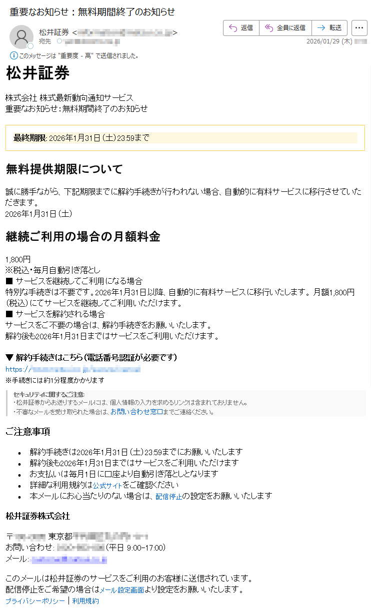 松井証券になりすました偽メール「件名:重要なお知らせ:無料期間終了のお知らせ」(本偽メールは、実在の企業と無関係に送信されたものです)