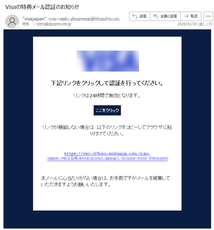 VISAカードになりすました偽メール「件名:Visaの特典メール認証のお知らせ」(本偽メールは、実在の企業と無関係に送信されたものです)