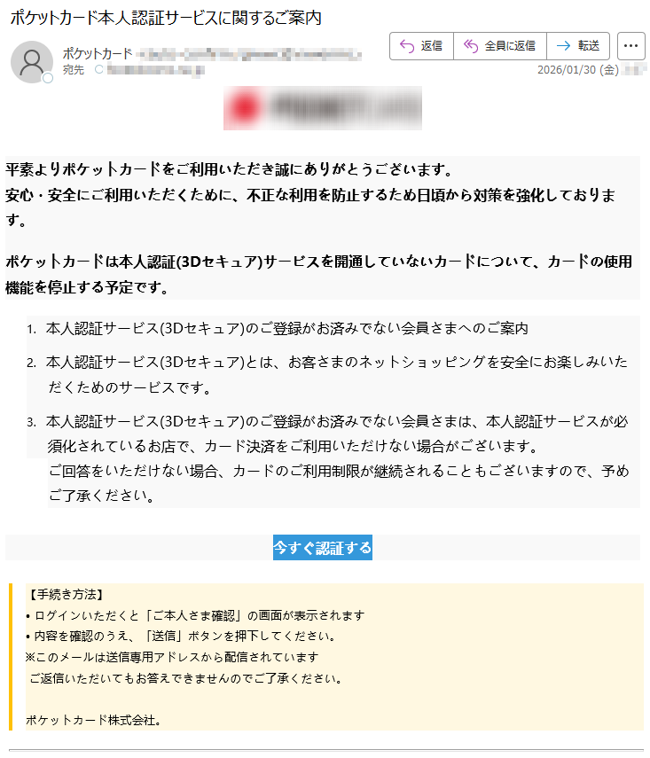 ポケットカードになりすました偽メール「件名:ポケットカード本人認証サービスに関するご案内」(本偽メールは、実在の企業と無関係に送信されたものです)