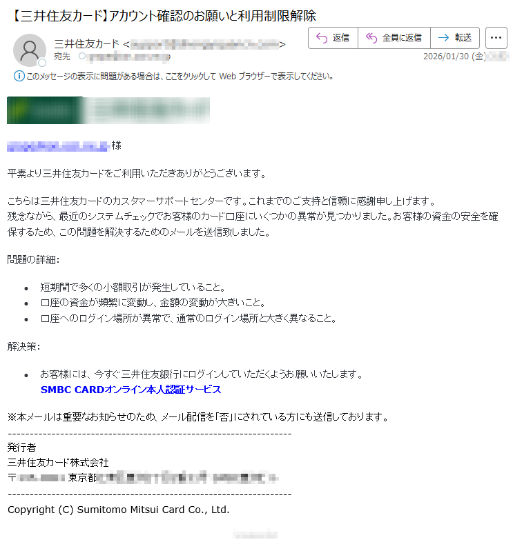 三井住友カードになりすました偽メール「件名:【三井住友カード】アカウント確認のお願いと利用制限解除」(本偽メールは、実在の企業と無関係に送信されたものです)