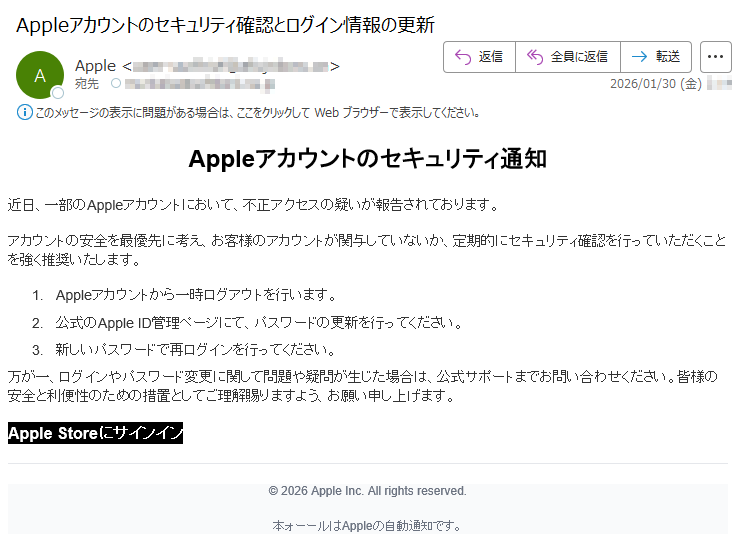 Appleになりすました偽メール「件名:Appleアカウントのセキュリティ確認とログイン情報の更新」(本偽メールは、実在の企業と無関係に送信されたものです)