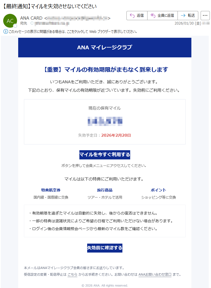 ANAマイレージクラブになりすました偽メール「件名:【最終通知】マイルを失効させないでください」(本偽メールは、実在の企業と無関係に送信されたものです)