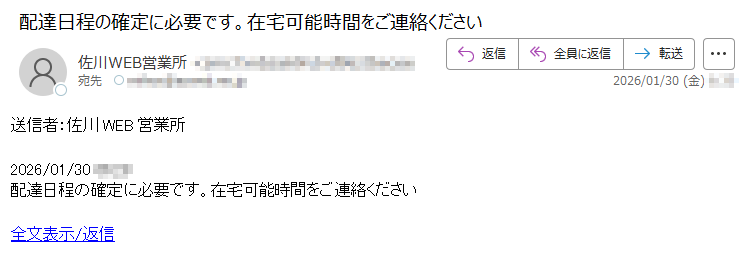配達日程の確定に必要です。在宅可能時間をご連絡ください
