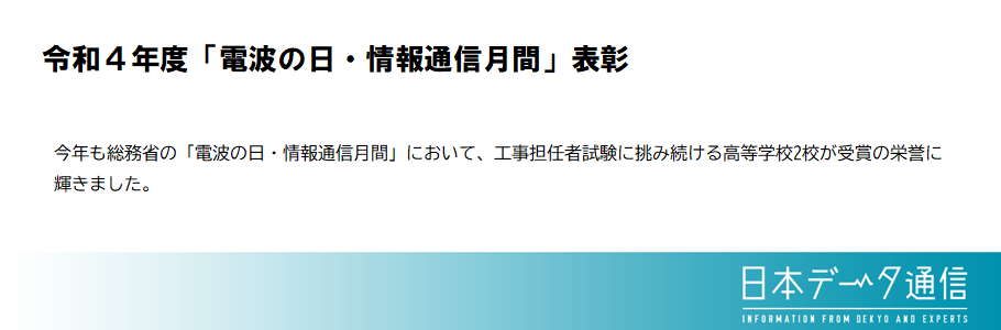 | 2025.01.10 | 機関誌「日本データ通信」に令和6年「情報通信エンジニア」優良団体表彰模様を掲載しました。 (学校の部) |