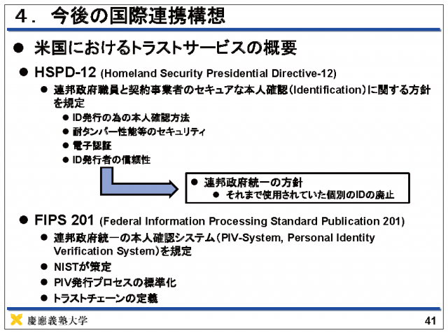 米国では、PIVやPIV-Iを含めた数多くの認証局が稼動し、統一的なポリシーの下でブリッジ認証を行いながら連携している。当初そうした動きが始まったのが2000年頃からで、日本もそのすぐ後には行政向けのJPKIなどの仕組みを構築し始めたが、民間向けの認証局との連携は考えられておらず、今後どうしていくのかは課題の一つである。こうした点もトラストサービス推進フォーラムで考えたい課題である。EU側のトラストリストとの関係も大事だが、アメリカサイドとの連携をどうしていくのかも大きな問題である。