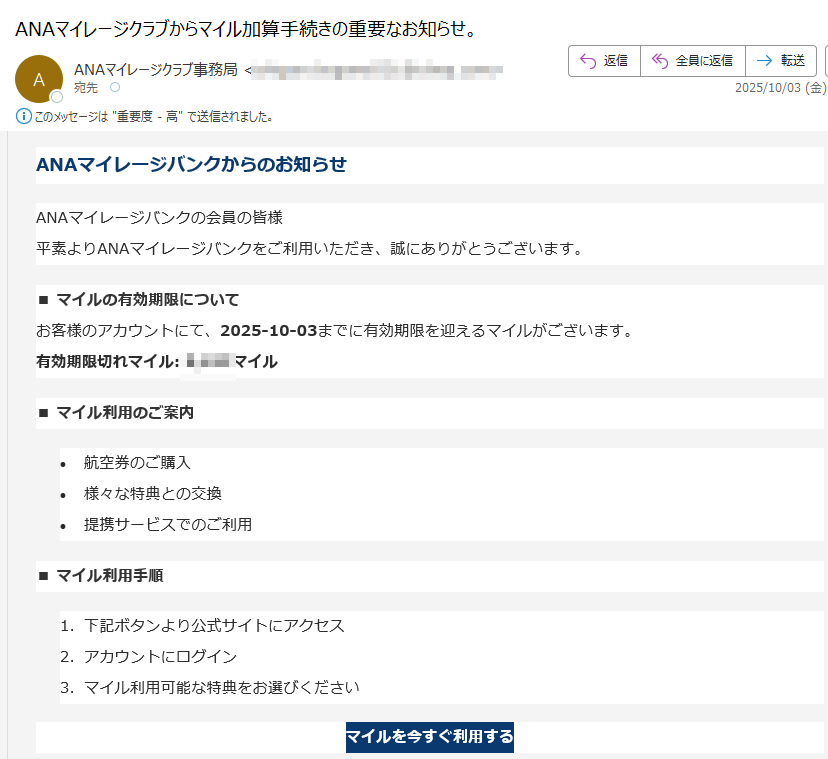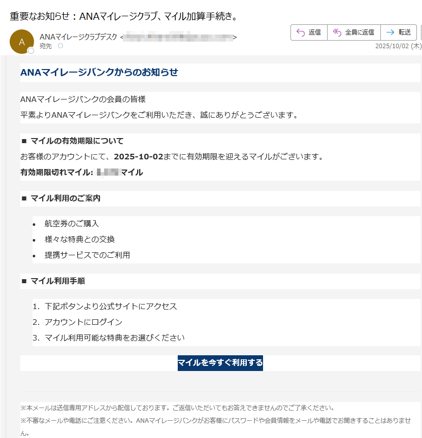 ![ANAマイレージバンクからのお知らせANAマイレージバンクの会員の皆様平素よりANAマイレージバンクをご利用いただき、誠にありがとうございます。■ マイルの有効期限についてお客様のアカウントにて、2025-10-03までに有効期限を迎えるマイルがございます。有効期限切れマイル:マイル■ マイル利用のご案内•航空券のご購入 •様々な特典との交換 •提携サービスでのご利用 ■ マイル利用手順1.下記ボタンより公式サイトにアクセス 2.アカウントにログイン 3.マイル利用可能な特典をお選びください マイルを今すぐ利用する ※本メールは送信専用アドレスから配信しております。ご返信いただいてもお答えできませんのでご了承ください。※不審なメールや電話にご注意ください。ANAマイレージバンクがお客様にパスワードや会員情報をメールや電話でお聞きすることはありません。[発行]ANAマイレージバンク](../../images/alert/2025/10m/nise_mail1003_17.png)