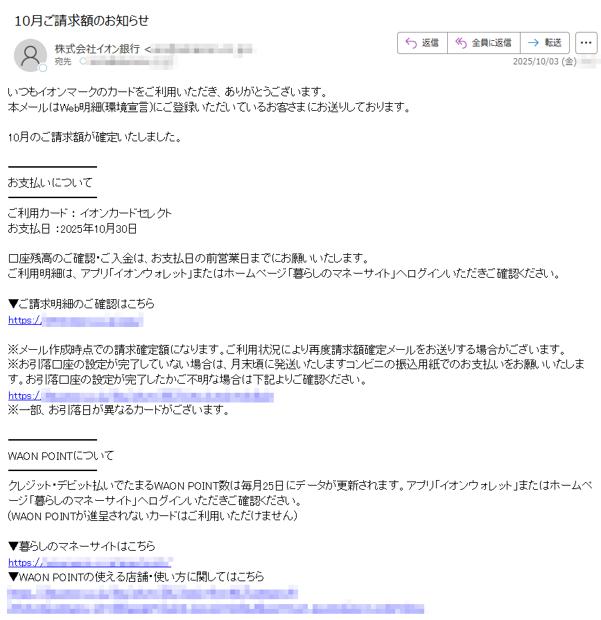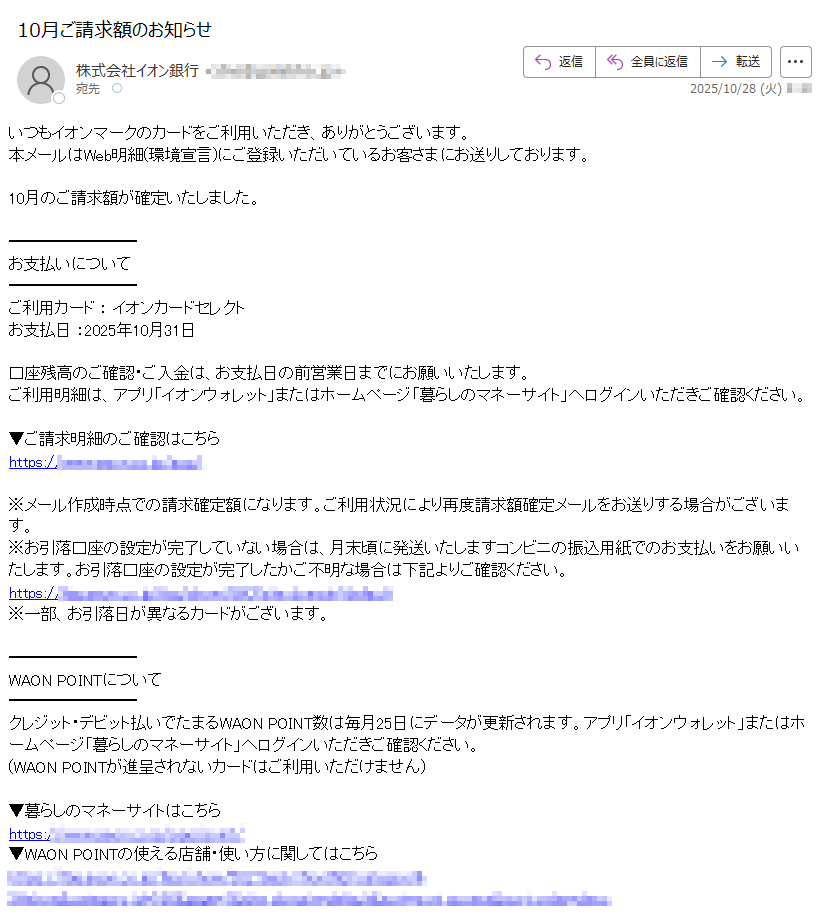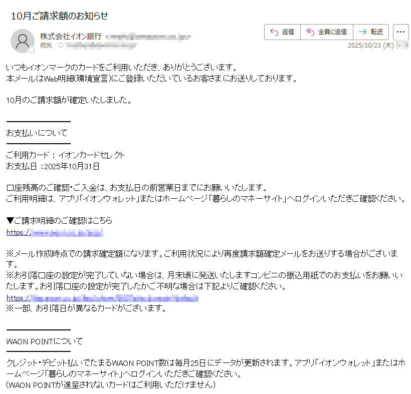 ![いつもイオンマークのカードをご利用いただき、ありがとうございます。本メールはWeb明細(環境宣言)にご登録いただいているお客さまにお送りしております。10月のご請求額が確定いたしました。お支払いについてご利用カード : イオンカードセレクトお支払日 :2025年10月31日口座残高のご確認・ご入金は、お支払日の前営業日までにお願いいたします。ご利用明細は、アプリ「イオンウォレット」またはホームページ「暮らしのマネーサイト」へログインいただきご確認ください。▼ご請求明細のご確認はこちらhttps:/※メール作成時点での請求確定額になります。ご利用状況により再度請求額確定メールをお送りする場合がございます。※お引落口座の設定が完了していない場合は、月末頃に発送いたしますコンビニの振込用紙でのお支払いをお願いいたします。お引落口座の設定が完了したかご不明な場合は下記よりご確認ください。https://※一部、お引落日が異なるカードがございます。WAON POINTについてクレジット・デビット払いでたまるWAON POINT数は毎月25日にデータが更新されます。アプリ「イオンウォレット」またはホームページ「暮らしのマネーサイト」へログインいただきご確認ください。(WAON POINTが進呈されないカードはご利用いただけません)▼暮らしのマネーサイトはこちらhttps:/▼WAON POINTの使える店舗・使い方に関してはこちらhttps://アプリやメールでおトクな情報が受取れます!イオンカード公式アプリ「イオンウォレット」ならご利用明細の確認やポイント交換はもちろん、会員限定クーポンも利用でき便利でおトク♪▼iPhoneをお持ちの方はこちらhttps:/▼Androidスマホをお持ちの方はこちらhttps:/▼イオンなどでのお買い物情報やカードキャンペーン情報もいち早くお届け!メールマガジンのご登録はこちらhttps:/お客さま情報の最新化についてご登録情報(氏名、住所、連絡先、メールアドレスなど)に変更がございましたら、暮らしのマネーサイトよりお手続きをお願いいたします。≪住所変更手続きのお願い≫お引越しなどで住所に変更が生じた際には、お早めに住所変更の届出をお願いいたします。お届けいただけない場合、郵送による重要なお知らせが届かない場合もありますのでご注意ください。▼カード登録内容照会・変更についてはこちらhttps://▼メールアドレスの変更はこちら https:/■イオンスクエアメンバーID・パスワードをお忘れの場合https://■お問い合わせ先https:/ このメールアドレス[]は送信専用アドレスのため、ご返信いただいてもご用件は承れません。当メールにお心当たりのない方は、大変お手数をお掛けいたしますが、その旨をお書き添えいただき下記アドレスまでお送りください。発行:株式会社イオン銀行https:/業務受託会社:イオンフィナンシャルサービス株式会社https://このメールに掲載された内容を許可なく転載することを禁じます。](../../images/alert/2025/10m/nise_mail1023_04.png)